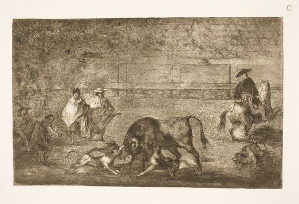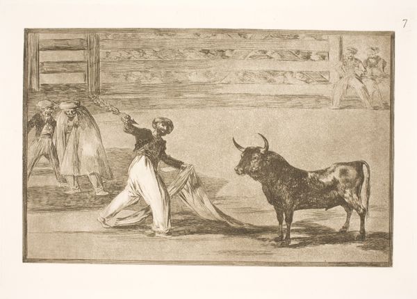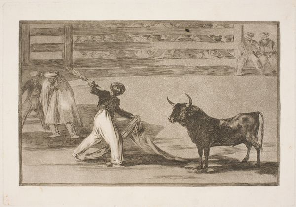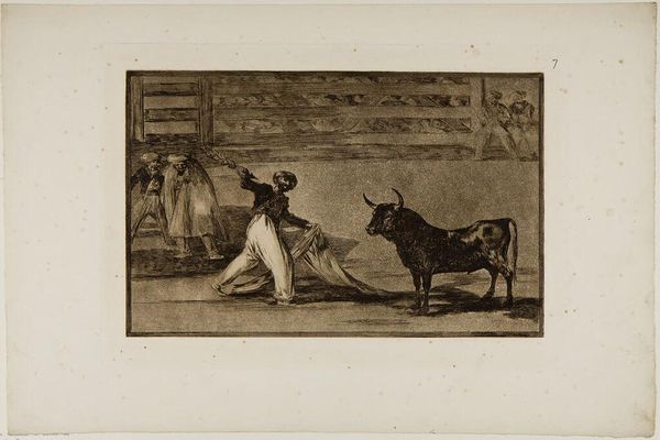 This etching, made by Francisco de Goya, presents an early form of bullfighting, focusing on the moment when harpoons, or banderillas, were first used. The bull, a symbol of untamed nature and virility, faces a combatant whose movements echo a dance of death. The cloth, manipulated to taunt the bull, is reminiscent of ancient ritualistic veils, tools that blur the line between man and beast. This recalls the Minoan bull-leaping frescos of Crete, where the bull was also a central figure. The origins of bullfighting may lie in similar prehistoric rituals. The bull's horns, symbols of power, evoke ancient beliefs in the bull as a deity or a sacred animal. Bulls were sacrificed in ancient Greece, and in Rome, bullfights were performed in honor of Mithras. Even today, the image of the bull, charged with symbolic meaning, resonates deeply within our collective memory, stirring primal emotions. In Goya's work, the bullfight transcends mere sport; it becomes a stage for the eternal confrontation between man and nature, culture and instinct. It's a spectacle that continues to evolve, carrying echoes of the past into the present.