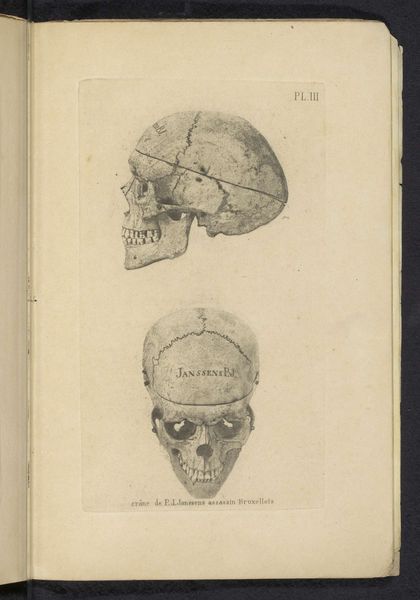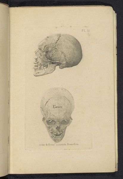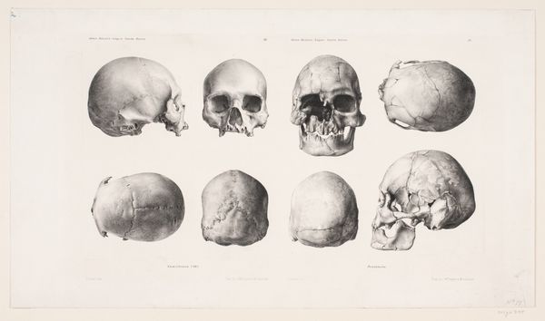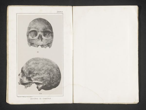 Editor: This is a photograph, a gelatin silver print, titled "Twee aanzichten van een menselijke schedel, en profil en bovenaanzicht"—or "Two views of a human skull, in profile and top view." It's from before 1869 and attributed to an anonymous artist. It feels strangely clinical, but also...vulnerable? I mean, it’s just a skull. What do you make of this piece? Curator: Clinical, yes, but I see more than just vulnerability. Consider the context: pre-1869 photography. Before medical imaging, this level of detail was rare. To me, this print whispers of scientific curiosity, a desperate attempt to understand ourselves from the inside out. It's as if the photographer were chasing shadows of human form. You feel that? What are shadows, really, but whispers and traces? Editor: That's a really evocative way of putting it. I hadn't thought about the scientific aspect so much, more the memento mori tradition, I guess. Curator: Memento mori is undoubtedly present— the eternal awareness of death. However, the objective medium of photography here makes it more about enquiry than acceptance. The anonymous nature intrigues me further; was this commissioned for research perhaps? Look at the way the light falls; highlighting every ridge, every cavity. Editor: So, it's not just a skull, it's a *record* of a skull. Huh. I guess seeing it that way makes the anonymity make a little more sense too. Curator: Exactly. It's humanity peering into the architecture of being. An ancestor captured for future eyes to observe with dispassionate awe. What lasting mark are *we* trying to make, I wonder, compared to this skull's accidental yet stark visibility in today’s world. Editor: That's given me a lot to think about. It really adds so much knowing how new photography still was when this was made.
