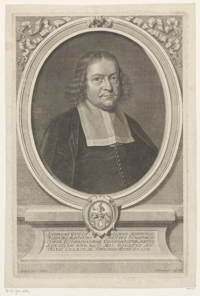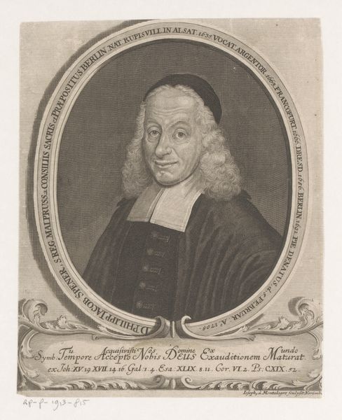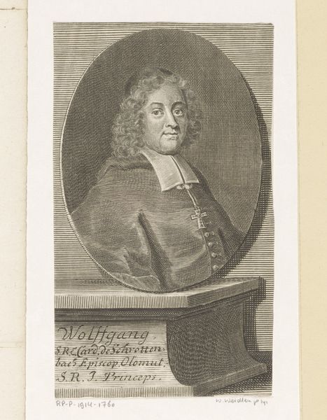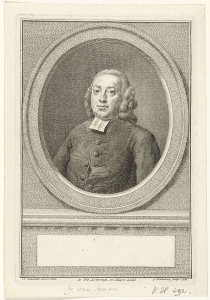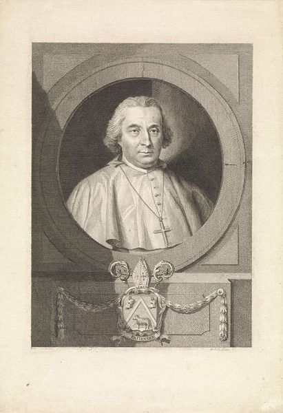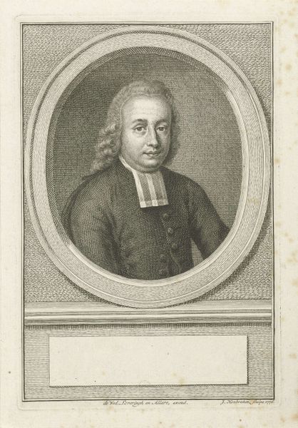 This is Georg Christoph Walwert's "Portret van Johann Conrad Löhe," an etching made in 1769. Immediately striking is the oval frame, a structure that both confines and elevates the portrait. Walwert masterfully uses hatching and cross-hatching to define form. The subject's face is rendered with subtle gradations, contrasting with the stark white wig and collar. Note how the light catches the forehead and cheek, creating a sense of volume. The dark coat provides a grounding element, its materiality suggested through varied line work. This contrast is not merely decorative. It directs our gaze, establishing a visual hierarchy that privileges the face as the locus of identity. The portrait is more than a likeness, but a study in the semiotics of power. Each element – the formal attire, the carefully composed expression – contributes to a constructed image of authority and intellect.
