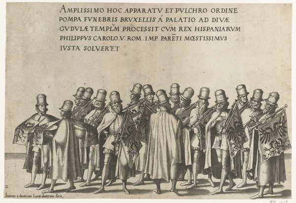 Curator: Today we're looking at a detail from Frans Hals's 1637 group portrait, "The company of Captain Reinier Reael and Lieutenant Cornelis Michielsz. Blaeuw," also playfully known as the ‘Meagre Company.’ It's an oil painting of a civic guard. Editor: Meagre indeed. There’s a prevailing mood of seriousness, almost grimness. The muted palette emphasizes blacks and grays punctuated only by the stark whites of their ruffs and collars. What an impactful use of chiaroscuro. Curator: I am fascinated by what "Meagre" suggests about the social dynamics at play. Hals had previously been lauded for group portraits such as his rendition of the Banquet of the Officers of the St. George Militia Company. This commission came much later and it's been posited that a rift had emerged between Hals and some sitters on the Reael commission. Do you get a sense of disaffection, judging by the composition itself? Editor: Possibly. Consider the spears held aloft. They slice through the composition, disrupting any sense of harmonious gathering, and there is no classical unifying compositional feature, but what to make of that light blue sash on the figure second from the right? It nearly escapes from the subdued tones. Curator: Let’s think about materials: Hals was at the peak of his artistic powers, quickly laying down strokes with incredible efficiency, even bravado. Consider too, the socio-economics of Dutch painting at this time; there was an open market for pictures, with artists often mass-producing for burghers with disposable income, and group portraits such as this reflect and reinforced social cohesion among Dutch elites. Editor: Indeed. Hals certainly understood how to capture textures—the sheen of polished armor, the intricate lace. You can almost feel the weight of their clothing. These details create a convincing illusion of depth and realism. Beyond the bravado and swagger, Hals has produced remarkable gradations of black. Curator: Knowing this work's process offers a view onto class structures that would be good for audiences to bear in mind, and in particular, Hals's working methods at this time; some consider that the "looseness" or "painterliness" so praised, may well be reflective of him having to create such vast canvasses more efficiently, even by farming out some of the work to assistants. It adds complexity to his position in Dutch art history. Editor: True. For me, I’m continually drawn to the play of light on each face, lending character, bringing those stern figures from centuries past so vividly to life. It remains compelling. Curator: Well, seeing those nuances enlivens my sense of their historical world—thank you for your observations. Editor: And thank you for directing my focus beyond the canvas itself.