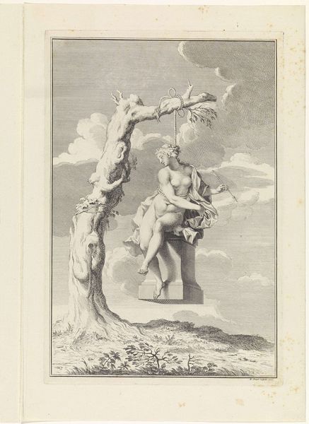 Curator: This compelling piece before us is a depiction of "Saint Sebastian," created sometime between 1623 and 1664, and it's attributed to François Chauveau. This engraving is part of the Rijksmuseum's collection. Editor: Immediately, I'm struck by the tension in this figure. He's obviously suffering, pierced by arrows, but there's also a strange, almost elegant, pose. Curator: It's intriguing, isn't it? Chauveau has chosen engraving, a meticulous printmaking technique. Consider the sheer labor involved in creating the network of lines that give the image form and tone. Look at the varied line weights—thin scratches for background shading, bolder gouges to define muscle. The consumption of time and skill is embedded within this work. Editor: The historical context is crucial. Saint Sebastian was often depicted during periods of plague because he was invoked for protection against disease. It seems that the public display of his suffering body was a way to grapple with broader anxieties about mortality and the vulnerability of the body politic. Curator: Absolutely. The printing process also makes it endlessly reproducible. How does the image and the potential for its multiplication shift our understanding of devotional imagery? This could have been for personal devotion, a book illustration, or part of a larger series. The possibilities point towards the commodification of religious imagery. Editor: And that access also changes how people engage with these stories. Seeing the physical vulnerability of a saint perhaps created a sense of intimacy, bridging the gap between the divine and the everyday concerns of Chauveau's contemporary viewers. Curator: Seeing how a print is created from an incised block complicates our common notions of original work. Are there social repercussions on artistry from a multiplication potential? Editor: This has been really valuable. Thinking about this work as a cultural object, it highlights not only the artist's skill and the subject's meaning but also how anxieties and power dynamics of the era play out on a printed page. Curator: Indeed, by exploring both the material making and the possible uses for it we begin to question art, consumption, and creation.