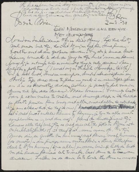 Curator: This is "Brief aan Mien Cambier van Nooten," possibly from 1937, by Dick Ket. It's an ink drawing on paper, a personal letter rendered with meticulous hand-lettering. Editor: My first impression is one of intimacy. The cursive is almost like a secret code, demanding a close, slow reading. It feels incredibly personal, almost as if we are intruding on private thoughts. Curator: Indeed. Ket’s artistic process often blurred the lines between the everyday and high art. He elevated personal correspondence into a work of art, using the materiality of ink and paper and the act of writing as a performance. This was likely made in his personal sketchbook. Editor: You can feel his hand moving across the page. I love how the text becomes image, the script forming little landscapes of words. It dances between legibility and pure abstract form. It's the handwriting as art more so than the message within. Curator: We know that Ket struggled with health issues for most of his adult life. Analyzing this letter, you almost feel the constraint, the delicate precision perhaps reflecting his physical condition. The act of carefully forming each letter could be seen as a form of control and mediation over his physical limitations. It’s not just writing, it's a labor of sorts. Editor: That makes the imperfections all the more poignant – the smudges, the occasional slips. It infuses the work with such raw humanity. And even if we cannot completely decipher its meaning now, that imperfect text gains value, showing that Ket gave his spirit to the reader through his craftsmanship and dedication to his letter recipient. Curator: Ket seemed very conscious of presentation and labor; consider the economic and social value placed upon skill at the time. It prompts us to question how we define artistic labor today in a world saturated with digital communication. Editor: Seeing something so carefully, lovingly made really brings that question into sharp focus. It is hard not to pause and find appreciation for such detailed work. Curator: Absolutely, a reminder to slow down and really see, even in the simplest of materials. Editor: A fitting note to end on; it’s definitely given me something to ponder!