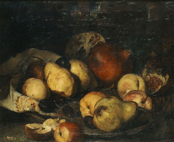 Editor: So here we have Courbet's "Still Life with Apples, Pear, and Pomegranates," painted in 1871 using oil. I am struck by how he seems to be less interested in rendering photorealistic fruit and much more interested in textures and the rough, visible brushstrokes. How do you interpret this piece? Curator: Indeed. Note how Courbet eschews smooth, idealized surfaces in favor of a raw materiality. It's less about accurate representation, and more about the presence of the paint itself. Consider the basket; its woven texture isn't carefully delineated, but suggested through a series of directional strokes. How do you see the interplay between light and shadow contributing to the sense of volume and mass? Editor: The strong chiaroscuro really makes them pop! And I can see where you are going about texture; it brings to mind what one might consider "ugly" with the heavy impasto. Does it almost make the familiar subject seem "defamiliarized"? Curator: Precisely. The composition invites close attention not merely to what is depicted, but *how* it is depicted. Observe how the artist repeats curves and spheres with color, line, mass, and space. Editor: What is the role of his restrained palette here? Curator: The earth tones emphasize the real rather than the ideal, allowing Courbet to explore weight and three-dimensionality through subtle modulations of color and tone rather than bright, artificial colors. Look closely – how does the treatment of the green apple contrast with that of the pomegranate? The roughness, is there, even here. Editor: The green apple definitely seems like it's catching more light than other parts of the painting. And I like how Courbet explored depth through light and texture alone, especially on that tablecloth! Curator: It challenges our conventional notions of beauty and representation by celebrating materiality itself. I have always struggled to define Courbet; however, he continues to challenge me! Editor: I have to agree. I think it's given me a completely new appreciation for Courbet's intention.