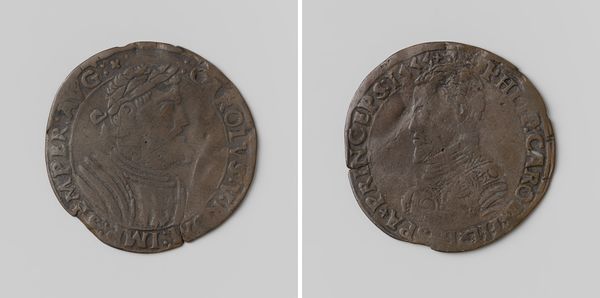 Curator: At first glance, there's an austere quality, despite its intricate details. The material, likely metal, gives it a weightiness, both literally and figuratively. Editor: Let’s take a closer look at this commemorative piece of artwork made by Pierre Regnier. The title is “Diana van Poitiers, hertogin van Valentinois”, crafted sometime between 1602 and 1640. As we observe the object closely, you may perceive that we're examining two sides of the same coin. Curator: Exactly. The profile on the front feels classical, almost Roman, projecting strength and refinement, yet it’s undeniably Mannerist in style. Editor: Observe the other side – there are symbols layered deep here. We see a depiction of what seems to be the goddess Diana and references of what seem to be love symbols intertwined, revealing connections to royalty and powerful family lineages. What is striking here, it all points towards powerful visual statements and narrative memory. Curator: Agreed, but note the formal restraint of line and how the textures provide almost tangible quality. Notice also the lettering running along the outer edge of the profile—adding not only visual balance but a level of intellectual intrigue. The script frames her presence, amplifying her influence through written words. Editor: Beyond artistic excellence, the enduring symbolic power reveals much about how past societies curated their memory and projected images of powerful individuals into future awareness. Such representations are not just artistry but tools to perpetuate cultural memory across generations. Curator: True, understanding the nuances within “Diana van Poitiers” goes beyond analyzing surface beauty. It invites dialogue concerning status, legacy and also perception. Editor: An apt final point, which speaks precisely to how such an early artifact as this can continue engaging present dialogues regarding significance, meaning and influence through constructed visuals.