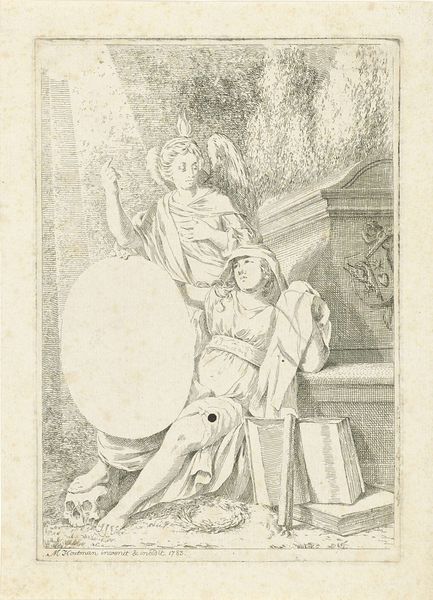 Curator: Here we have a drawing called "Cupid with a Bird on a String," attributed to Joseph Werner the Younger and estimated to have been created sometime between 1637 and 1710. It is executed in ink on paper. Editor: There's a disquieting stillness to this piece, even with Cupid's animated gesture. The restricted tonal range creates an atmosphere that almost verges on melancholy. Curator: The dynamism in the drawing certainly comes from Cupid's reach toward the bird and the diagonal pull of the string. Note how the Baroque style employs asymmetry and implied movement. Semiotically, we see an allegory here, as Cupid, the god of love, controls the bird. It’s a power dynamic portrayed rather subtly. Editor: It also reflects the socio-political hierarchy in viewing pleasure. The upper classes might have delighted in the suggestion that love, like a pet, could be captured or dominated, which resonates with the power imbalances that were very common in the 17th century. How do you view the staging of this work? Curator: The staging is fascinating. The artist establishes a complex, architecturally defined space, then sets this allegorical action within it. This emphasizes the role of environment in defining identity and influence, both of Cupid and his potential “prey.” But there’s a detachment from realism, with focus placed instead on forms and gestures as a type of visual code. Editor: Right, that detachment speaks volumes, the drawing also provides a perspective on the consumption and display of artworks. Patrons would likely have commissioned or collected pieces like these to demonstrate cultural literacy and refine tastes in a drawing room such as the one presented in this scene. Curator: Absolutely, and viewed through a purely formalist lens, the effectiveness resides in how line, light, and composition merge to evoke emotion through structured artifice. Editor: And on an ending note, to consider these artistic intentions within their historical setting brings depth and reminds us that this drawing is not simply an image but is, in fact, a statement within society and culture. Curator: A statement that's eloquently translated into artistic expression using all its constituent pieces and how the viewer responds to it visually.