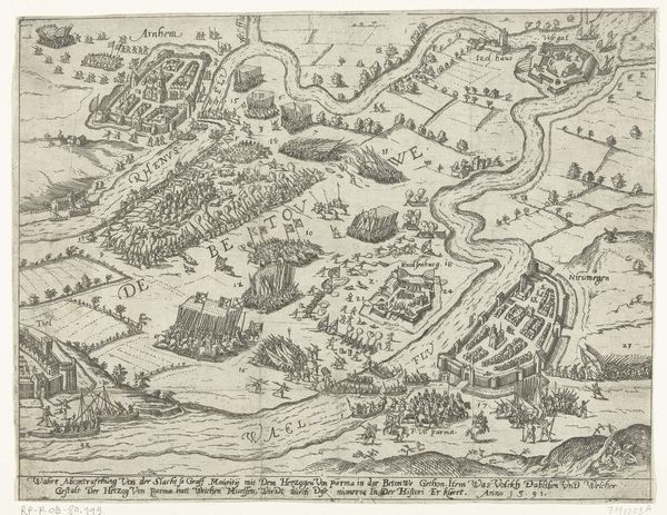 Editor: So, here we have an anonymous drawing from 1610 titled "Beleg van Gulik," or "Siege of Gulik," held at the Rijksmuseum. It's an etching, incredibly detailed with fine lines showing the city and surrounding encampments. It feels almost like looking at a meticulously rendered map. What jumps out at you when you see this work? Curator: The weight of history, literally pressed into these lines. It’s a fascinating dance between documentation and memorial. Sieges, historically, were more than just military actions. They were rituals, prolonged performances of power, full of symbols intended to terrify, persuade, and ultimately, dominate the cultural memory of the defeated. Do you notice how orderly the siege appears? Editor: I do! It's surprising, almost clean. The layout seems more organized than chaotic. I guess I imagined sieges as purely destructive. Curator: Exactly! The "order" reflects the ambition to re-order. Note the precise lines of the fortifications, mirroring the grid-like structure within the city walls. It shows the imposition of one cultural and political order onto another. Sieges weren't solely about destruction; they were about creating a new visual order, embedding a new power structure into the very landscape. The memory of this new order then becomes etched in the cultural psyche. What symbolic gestures do you notice? Editor: The tents, uniformly placed around the city. They do reinforce a sense of control and almost overwhelming power. I see that it isn't just an illustration; it represents something larger. Curator: Precisely! It reflects not only a military endeavor, but also attempts at cultural transformation and control over collective memory. Seeing beyond the superficial layout shows how such works impacted those viewing them. Editor: I hadn't considered how meticulously a siege reshaped space and collective memory. Now I understand how deeply symbols were woven into this type of historical documentation. Curator: And hopefully appreciate the enduring resonance of the “Beleg van Gulik”. Visual depictions become carriers, transmitting not just information but also embedded ideologies across generations.