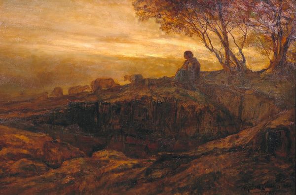 Thomas Moran’s ‘Twilight Landscape’ captures a scene bathed in the warm glow of the setting sun, a symbol of closure. The two figures walking into the landscape draw our attention. We see pairs journeying through the wilderness as an archetypal image; it evokes the story of Adam and Eve's expulsion from Paradise. This recalls the universal human experience of leaving behind an old life for an uncertain future. The motif of a couple walking into the sunset, symbolizing hope or despair, is evident throughout art history. From biblical scenes to Romantic landscapes, the figures represent the continuous thread of human experience, a powerful force engaging viewers at a deep level. Consider how the golden light, often a symbol of hope, has been reframed and reinterpreted throughout history. Twilight holds the promise of a new dawn.