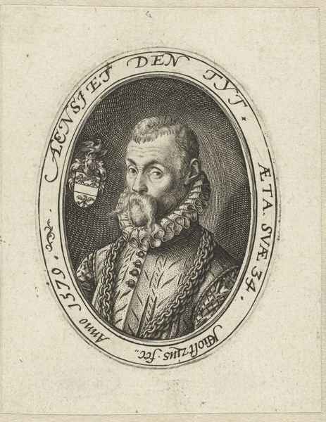 Editor: Here we have "Portret van een onbekende man," an engraving from between 1549 and 1584, by an anonymous artist. It has an almost stark feel, because of the medium. How might we interpret this portrait within its historical moment? Curator: An engraving like this served a vital public function during the Renaissance. Consider it less as high art and more as a form of visual communication. How do you think it might have circulated? Editor: Maybe as a printed sheet, or bound into a book? To spread ideas? Curator: Exactly! These prints were often reproduced and distributed widely, helping to solidify someone's public image. A portrait, even of an unknown man, suggests power and status that would be very aspirational. The chain and detailed clothing imply a certain social standing, reflecting the concerns about hierarchy in the 16th century. Think about the institutions that this image might have been linked to; political organizations, guilds, wealthy families. Can we really consider it "anonymous" if it reflects the dominant culture so closely? Editor: So, it's not necessarily about capturing a likeness but more about conveying a particular social message? Curator: Precisely. The political forces were deeply invested in image construction, and dissemination of acceptable images through print culture was their mandate. These images often helped to solidify hierarchies and project idealized versions of leaders and influential figures to the masses. Editor: I never really thought about the political dimension of what appears to be just a simple portrait. Curator: Examining art this way always allows a deeper understanding of what these artworks might mean for a society. There is much more to portraits than mere appearance.