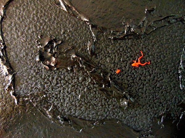 Curator: Alexander Roitburd's 2008 artwork, "Blood Sausage," executed in acrylic paint with a matter-painting technique, presents a fascinating study in texture and tone. What are your initial impressions? Editor: Immediately, I’m struck by the impasto – that thick, almost sculptural application of paint. The color palette is predominantly deep red-brown, punctuated by off-white and pale brown shapes. It gives off a sense of dense, earthy weightiness. Curator: Roitburd’s titles often carry a symbolic weight, layering meaning onto his abstract forms. Consider “Blood Sausage.” Sausages, particularly blood sausage, are deeply ingrained in cultural memory, often associated with feasting, tradition, and even sacrifice. Editor: I see it! There’s an almost repulsive yet captivating quality. The amorphous blobs do suggest organic matter, and the color, of course, amplifies that sensation. Formally, I’m interested in how the white shapes act as compositional anchors against the dark background. They draw the eye around the canvas. Curator: And what do you make of the textures themselves? They evoke something beyond the culinary. Roitburd frequently incorporated elements of decay, referencing fleeting mortality. There’s a sense of transformation. Editor: The impasto definitely enhances that feeling. It’s as if the painting itself is in a state of flux, both solid and fluid. It subverts any sense of clarity or easy definition, refusing a clean reading of the “forms”. Curator: Roitburd explored themes of cultural and national identity in much of his art, particularly his Ukranian heritage. Perhaps here, “Blood Sausage” acts as a kind of brutal metaphor. What resonates as a culinary and cultural item is subverted and corrupted. Editor: Absolutely. It becomes this sort of embodied cultural artifact, almost repulsive. Thinking of it through the lens of formal tensions, it offers a really disturbing, and I would argue, powerfully evocative visual experience. Curator: Exploring the symbolic richness of the title, and through consideration of this dense physicality, the painting comes to embody and transform collective anxieties around life and decay. Editor: For me, focusing on how these colors and shapes interact emphasizes that tension, how beauty and disgust can be found coexisting in a single piece.