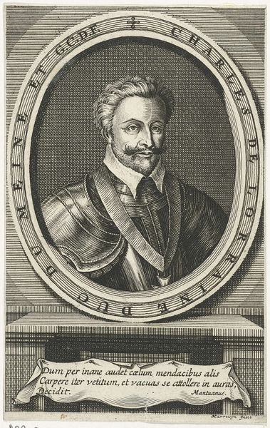 Curator: Here we have François de la Roussiere’s portrait of Michel de Castelnau, currently held at the Harvard Art Museums. It’s quite striking, isn’t it? Editor: Yes, the detail is incredible. The artist used what appears to be very fine lines to achieve almost photorealism in the face while creating a dense pattern that defines the figure's fashionable clothing. Curator: Indeed. Notice how Castelnau's stern gaze projects power and authority. His clothing and collar indicate status, as does the emblem with heraldic symbols beneath the portrait. The visual cues speak volumes about his identity. Editor: I find the texture and the subtle gradations of light particularly compelling, suggesting the artist had a deep understanding of semiotics and how best to represent the social standing of the sitter. Curator: The lions, castle, and fleur-de-lis resonate through history. Castelnau, as an ambassador, carries the symbolic weight of France with him. This image reinforces that role. Editor: It is through the interplay of these carefully constructed visual elements that we understand the work’s intent. The symbolism is the key to unlocking its historical context. Curator: Absolutely. It's a powerful visual representation of identity and status. Editor: A stunning example of visual rhetoric.