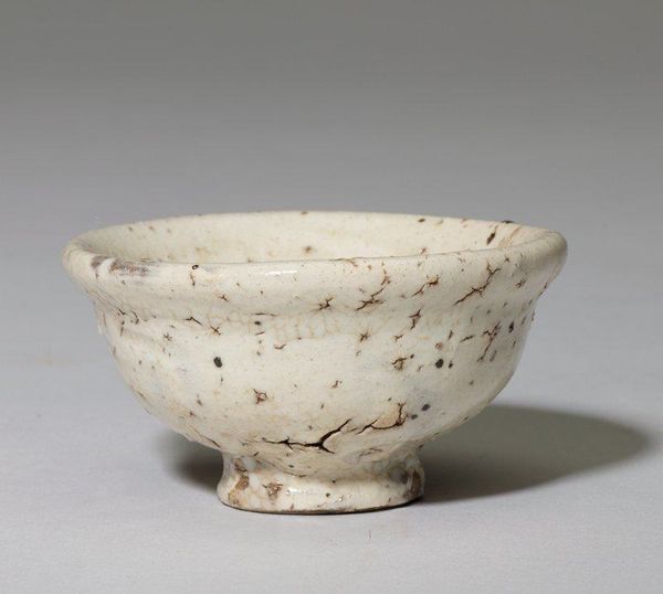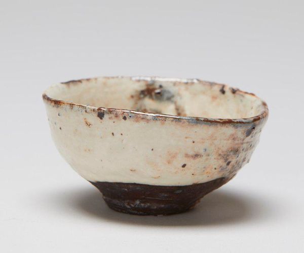 Editor: So, this is a sencha cup with poem, made of earthenware around the 19th century by Ōtagaki Rengetsu. The simple shape and earthy tones give it a sense of rustic charm. What are your thoughts when you look at this cup? Curator: My interest lies in understanding the labour and material circumstances of its creation. Earthenware, a common material, is transformed here, suggesting accessibility. However, Rengetsu's integration of poetry onto the cup elevates it beyond mere utility. The act of inscribing text becomes a critical part of its creation and function, doesn’t it? Editor: That’s true! The inscription adds another layer of meaning to the cup. Curator: Precisely. Consider Rengetsu’s position in society as a Buddhist nun and artist. Did she craft these cups independently, controlling all aspects of their production, or did other hands assist in some processes, influencing the final piece? Was the creation individualistic or social? Also, who was it intended for? And how might the poem intersect with the experience of drinking tea? Editor: That's fascinating! Thinking about the labor behind it, it makes you consider if she considered this high art or more a functional craft? I wonder what her intention was behind making this piece... Curator: Absolutely, the traditional high/low art dichotomy crumbles under materialist scrutiny. The purpose behind it affects its cultural position significantly. Reflecting on production, consumption, and its function gives us so much to ponder! Editor: This gives me so much more to think about than just appreciating its aesthetics! Thanks for your time. Curator: My pleasure. The object holds many narratives when you consider these various perspectives.