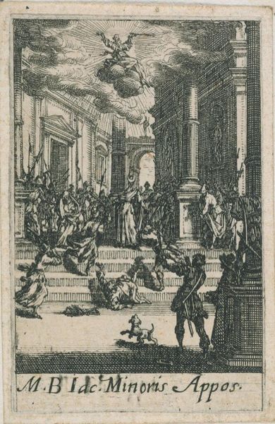 Editor: Here we have Jacques Callot's "Martyrdom of Saint Matthew," a tiny etching from the 17th century held at the Harvard Art Museums. It's just... intense. So much happening in such a small space. What do you make of it? Curator: It's a drama bomb, isn't it? Callot crams so much theatrical violence into this miniature stage, it's like Baroque cinema. Look at the angel floating above the chaos—a beacon of serenity amidst the brutality. I wonder, does that contrast amplify or diminish the horror? Editor: I hadn't thought of it like that. It's definitely a lot to take in. Curator: Exactly. The magic of art is that it invites us to linger, to peel back the layers of meaning, even in something so seemingly straightforward. An awful, intense, beautiful, and perplexing image!