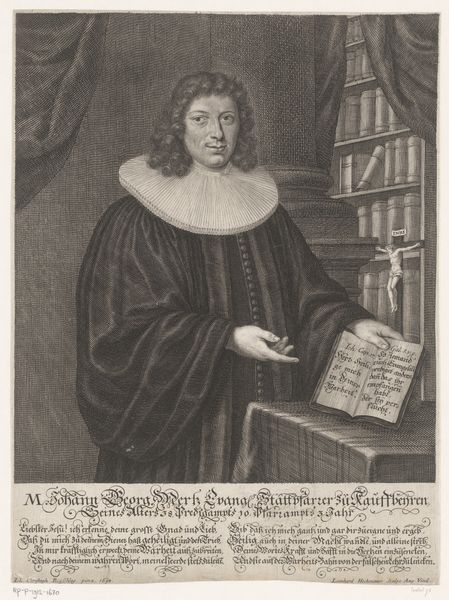 Editor: This is a print titled "Portret van Johannes Meisner," dating from between 1665 and 1721. The portrait is intricately detailed, conveying a sense of quiet solemnity, further amplified by the contrasting values within the print itself. How do you approach analysing something like this? Curator: Indeed, the balance is masterful. We can appreciate how the artist has rendered the subject through an artful distribution of dark and light areas to define shapes and add depth. Let’s observe the arrangement of forms: the sitter occupies the centre, creating immediate presence, a visual anchor, around which everything else is organised. What effect does the placement of the book have, held as it is? Editor: The book certainly commands attention; the sitter is clutching the book firmly, perhaps to denote education or scholarship, or even a reference to religious scriptures. It creates a secondary focal point that pulls the eye, leading the viewer to consider both the man and the ideas he represents. Curator: Precisely. And what about the quality of line? Consider the different textures rendered. How does the artist delineate the fabric of the gown in contrast to the texture of the hair and beard? What visual strategy does the artist employ? Editor: The gown appears darker and heavier. It grounds him, while the flowing hair provides a sense of movement, softening the overall effect. The different line qualities are stunning. The lines describing his robes are simpler. His hair seems unruly, almost free flowing by comparison. Curator: We see how contrast is not only of tone but of texture too, activating the visual field through varied markings and controlled organization. Editor: Thinking about this engraving purely in terms of form and composition has definitely given me a new appreciation for its detail. Curator: The ability to view artworks from differing lenses will no doubt influence how you appreciate art as a whole.