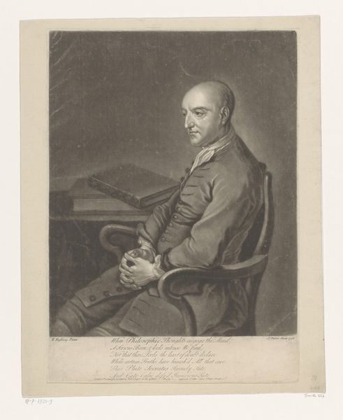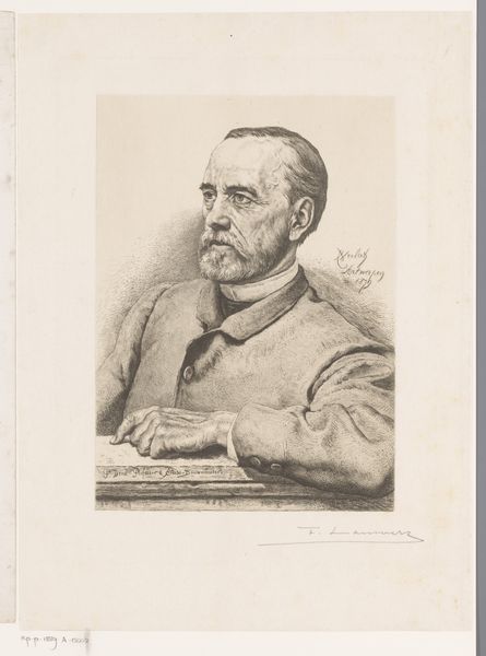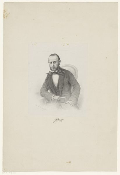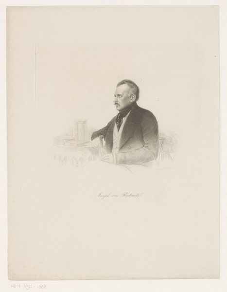 Curator: Here we have Johann Leonhard Raab's "Portret van Franz Adam," created sometime between 1840 and 1899. The medium is engraving, a meticulous and demanding printmaking process. Editor: It's a somber portrait, wouldn't you say? The limited tonal range emphasizes texture, but the overall mood feels rather… reserved. Curator: Precisely. Consider the labor involved in creating such a work. The artist meticulously carves lines into a metal plate, controlling the depth and density of each mark to produce tonal variations. Engraving demands highly skilled artisans. Editor: The composition guides your eye carefully around the piece, from the gaze out towards the background to the elegant holding of the hat and stick. All are perfectly rendered in relation to each other in order to form a powerful symbolic harmony. Curator: Right, but this wasn't just about artistic expression. The context of production reveals the engraving as a reproductive medium, used to disseminate images and knowledge in a pre-photographic era. These prints made art accessible. Editor: That may be, yet I find the real success here comes in the way Raab constructs the face. He captures an incredible likeness with just etched lines. The way the light catches his cheekbones, and how much emotion lies in the downturn of his lips. Curator: And don't underestimate how this connects to socio-economic conditions. The patronage system influenced the subject matter and function of engravings. Portraits like this elevated individuals by aligning them with aesthetic and intellectual culture. Editor: Still, even with its commercial function, I would also say this engraving manages to achieve a captivating formal presence that persists over time. Curator: That interplay, I believe, encapsulates much about art from this period: an adherence to Realism coupled with reproductive technologies and cultural elitism shaping perceptions of individual worth through these meticulously produced objects. Editor: Very insightful. It reminds us how artworks can exist as documents of technical and historical significance while offering us opportunities to discover new emotional and formal interpretations.
