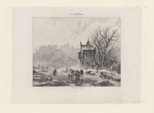 Editor: This is "Winterlandschap met kasteel," a landscape by Adolf Carel Nunnink, likely made between 1847 and 1865. It's an engraving. I find it quite charming, actually, capturing a slice of everyday life. What jumps out at you? Curator: Well, considering the time, look at the material conditions of production. This isn't just a pretty picture. Engravings are labor-intensive, demanding a skilled artisan and access to specific tools and materials. It begs the question, who was this print *for*, and how was it distributed? Was it luxury good or widely accessible? Editor: So, less about the people skating and more about... who printed it and how it circulated? I suppose the "genre scene" aspect, as it's tagged, is almost secondary to the process itself? Curator: Precisely! And consider the choice of *print* as the medium. It democratizes the image, in a way, allowing wider circulation than, say, an original painting only the wealthy could acquire. But also restricts circulation by virtue of technological development at the time, making prints accessible only to the burgeoning merchant middle class. Editor: I never really thought of prints in that way. It is interesting to frame it as something circulating depending on those merchant middle classes. Curator: Now consider how prints are material, as printed on papers that deteriorate, in contradistinction with painting mediums. Its relative longevity indicates that it was regarded, but its circulation might have given its place and meaning to a domestic, everyday use. These tensions, the interplay between the subject matter, the means of production, and its intended audience—that’s where the real story lies. It tells us about consumption, about taste, and how value was assigned to images. Editor: That shifts my whole understanding of prints! Thank you for your time! Curator: My pleasure! Thinking materially changes everything.