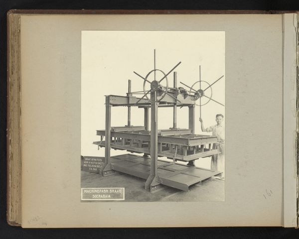 Editor: This gelatin-silver print, possibly from 1934, titled "Borders met kookpannen," is fascinating. It reminds me of a landscape, only instead of nature, we see an industrial structure of beams and metal. What do you see in this photograph? Curator: I see a clear example of modernist aesthetics applied to industrial subject matter. It challenges the conventional divide between high art and documentation. Look at how the photographer frames the support structures as an almost heroic landscape, while the signage, “Borders met Kookpannen," speaks to mass production and utility. Editor: I never thought of it as challenging that divide. What does focusing on the materiality and production tell us? Curator: By foregrounding the gelatin-silver printing process and industrial infrastructure, the artist directs our attention to the labor and means of production behind even seemingly mundane objects. It prompts us to think about the social context: Who built this structure? What purpose did these “cooking pots” serve in that context? How were they produced and distributed? Editor: It really does make you think beyond the image itself, and consider what it represents within a broader economic and social framework. The industrial context suddenly feels important. Curator: Exactly. Considering materials and their cultural uses challenges established hierarchies in art and elevates the significance of labor and production processes. Editor: I’ll definitely look at other modernist photos differently now. Thanks for sharing your insights. Curator: My pleasure. Thinking materially transforms how we view images and objects in all kinds of interesting ways.