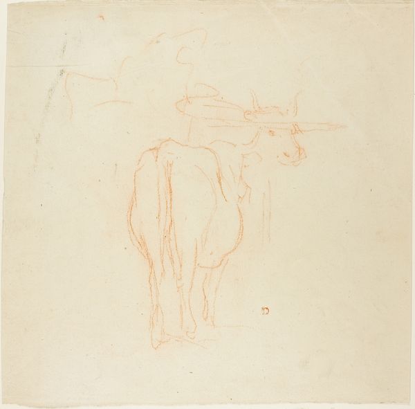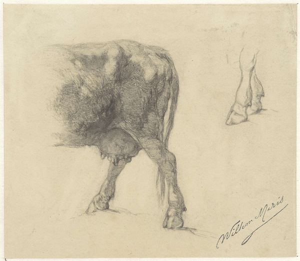 Max Klinger created this drawing called "Weg der Befleckung" - "Elefant og snusende hund" using pen and brown ink. The composition immediately presents us with a stark contrast in scale and form: a massive elephant viewed from behind, its bulk rendered with a network of delicate lines, dwarfing a small dog sniffing inquisitively at its rear. The elephant's solid form is built through subtle gradations of tone, while the dog is sketched with an economy of line, emphasizing their differing presence and roles within the space. Klinger masterfully uses line to imply texture and volume. The rear view denies us the expressive face of the elephant, shifting our focus to its physicality and the canine's curious investigation. This juxtaposition might symbolize the disparity between the powerful and the vulnerable, or perhaps the oblivious and the inquisitive. The drawing leaves room for contemplation, inviting us to consider how the relationships are structured and framed by the artist's choices. The meaning is not fixed, but emerges through our ongoing observation and reflection.