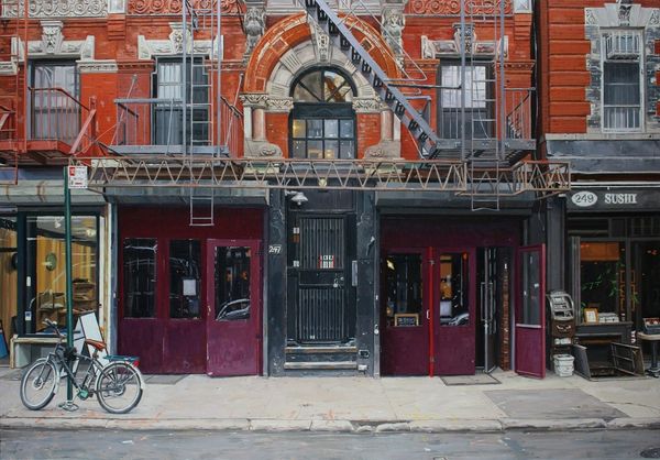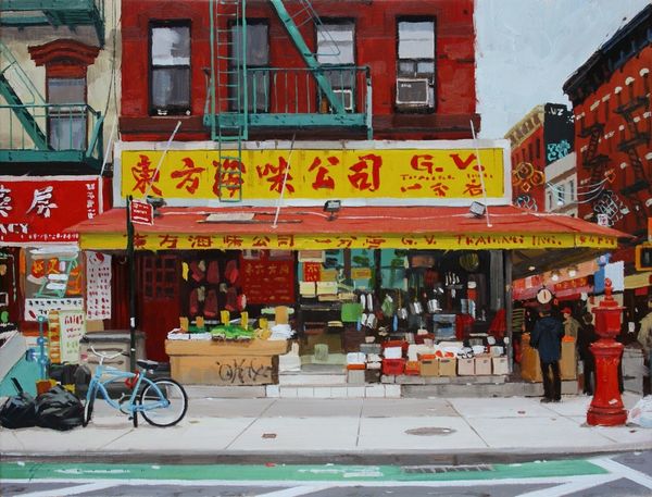 Editor: So, this is "Red Facade in China Town" by Vincent Giarrano. I'm really struck by the, almost overwhelming, redness of it all. It's vibrant and feels incredibly alive, yet also sort of claustrophobic. What jumps out at you? Curator: It’s a delightful paradox, isn’t it? That red hits you like a gong, demanding attention. It’s more than just a color; it's a statement. The artist isn't just painting a building, but a whole cultural energy, condensed and presented with incredible focus. And look closer: it is not ONE shade of red, but variations – implying vibrancy AND a sort of decaying reality, what do you think? Editor: I see what you mean! It makes it seem almost…unreal. Like a film set. And it kind of tells a story about the history layered within this one facade. Curator: Precisely. The layering. That is so, so key. Giarrano isn’t just showing us Chinatown, he's hinting at time itself, those years of accumulated stories and human dramas, all etched onto those bricks and shop signs. Like an urban palimpsest, rubbed raw to show many earlier layers underneath the visible surface. The red is almost protective in its brightness...a loud invitation. Editor: I hadn’t considered it like that. I was too caught up in the surface! This is incredibly helpful and I will remember this approach as I visit other Chinatown locations and photograph/document/critique. Thank you for opening my eyes! Curator: My pleasure! May this moment make your viewing (and creative endeavors) much richer moving forward, always.