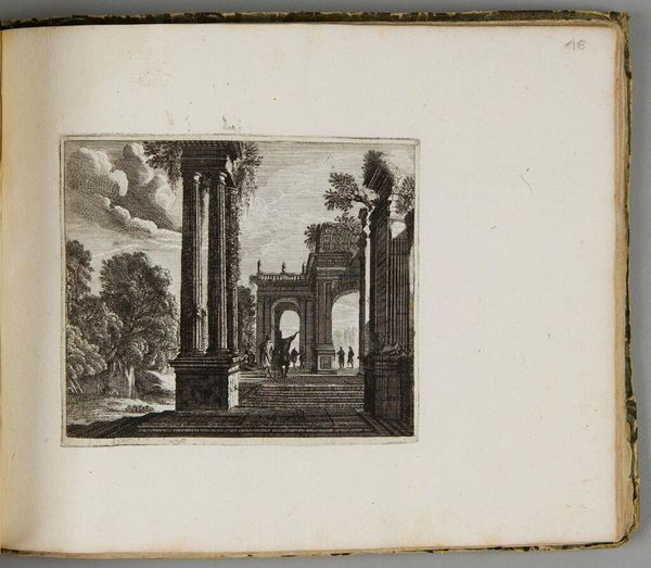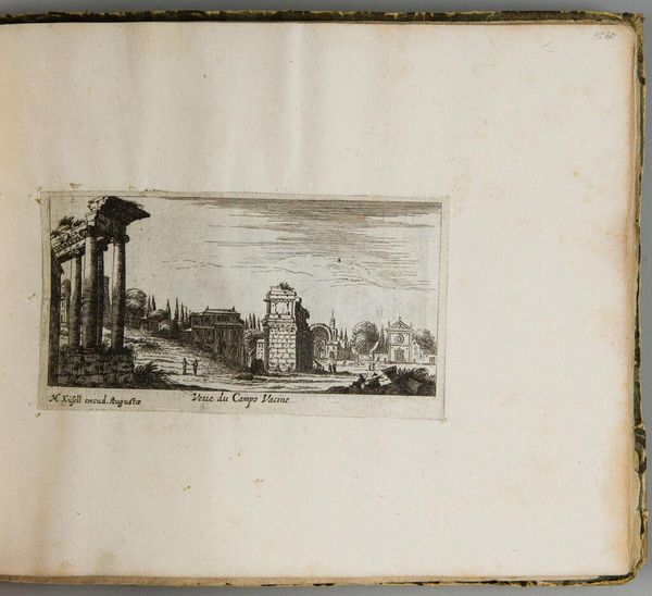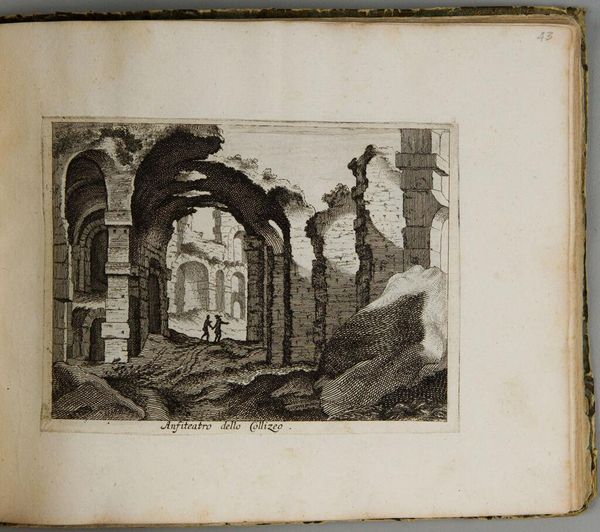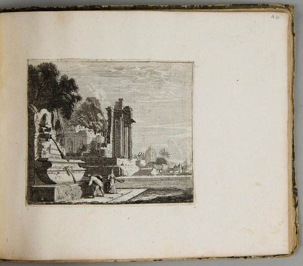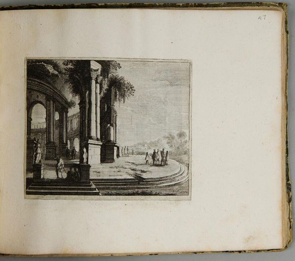 Editor: This small, untitled print by Melchior Küsel shows classical ruins with figures. It feels like a commentary on the transience of power. What do you see in this piece? Curator: I see an intersection between romanticizing the past and critiquing empire. The ruins signify a fallen power, while the figures almost seem to be scavenging the remains. How might this image speak to contemporary anxieties about cultural loss and societal decay? Editor: So it’s not just about history, but about how we understand our place in a cycle of power? Curator: Precisely. And consider the context of its creation – what political messages might Küsel be subtly embedding? Editor: I hadn’t thought about it that way. Thanks, that’s really interesting. Curator: My pleasure. It reveals how art can both reflect and challenge dominant ideologies.