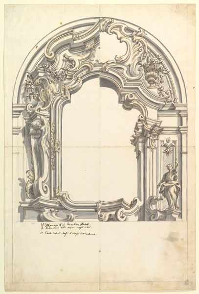 Editor: Here we have a drawing titled "Design for an Altar" dating back to somewhere between 1700 and 1780, currently residing at The Met. It looks to be rendered with print and drawing media. What immediately strikes me is its geometric and architectural emphasis, but I'm also wondering about its functionality beyond pure aesthetics. What can you tell me about this design? Curator: It’s fascinating, isn’t it? This design offers a powerful entry point for exploring the intersection of religious expression, architectural ambition, and societal control during the Baroque era. Consider how such altars visually reinforced hierarchical power structures, dictating the gaze and shaping spiritual experiences. How might the opulence, expressed by geometric shapes and architectural elements, play a role in defining the relationship between the individual and the divine? Editor: That's a perspective I hadn't considered fully. I was so caught up in admiring the technical skill that I didn’t consider it could have a darker undertone of reinforcing social hierarchies! So you see this artwork through the lens of power dynamics? Curator: Absolutely. The very act of creating such a lavish altar—requiring specialized skills and resources—speaks volumes about the church's socio-economic position. Ask yourself, who had access to this space? Whose stories were told and whose were erased within its ornate framework? We must examine the societal structures that this altar reflects and reinforces, considering the impact on various groups – women, the poor, marginalized communities. Editor: This completely changes how I see this work! Instead of merely admiring the craftsmanship, I can think about how this design served certain interests in Baroque society, excluding others. Thanks so much. Curator: It is through such critical inquiry that we can unlock deeper truths about our shared past. Understanding art as a reflection of cultural forces empowers us to challenge existing norms.