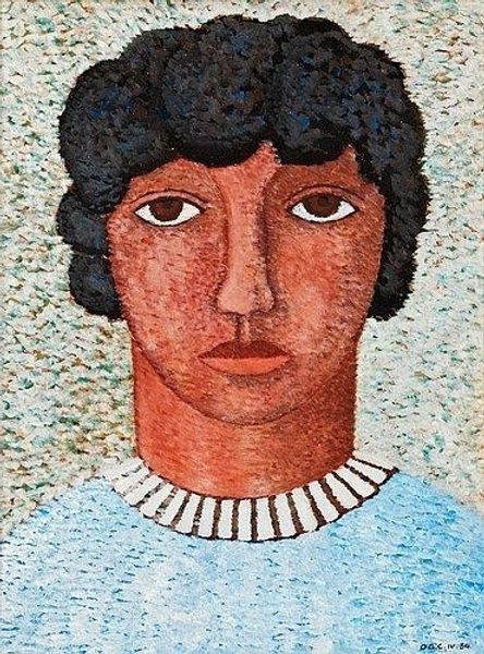 Curator: This is Frida Kahlo's Self-Portrait Very Ugly, created in an unknown year. The portrait is quite small, just 23 by 22 centimeters. Editor: Even at this scale, the intensity is palpable. The rough texture of the paint, the raw depiction of her face, it feels incredibly immediate and almost defiant. Curator: Kahlo often used self-portraits to explore her complex identity, her physical and emotional pain, and her place in a patriarchal society. The title itself is a direct confrontation with societal expectations of beauty. Editor: And the materials themselves—this isn't a polished, idealized image. It's raw, with visible brushstrokes and a certain earthiness. That apple and the insect hovering nearby, are they symbols of decay or perhaps resilience? Curator: It’s fascinating how she directly inscribes text, "SI" and "VERY UGLY," challenging the viewer to engage with her self-perception and the power dynamics inherent in how women are viewed. Editor: It’s a powerful assertion of self, isn’t it? Not seeking external validation, but owning her image, her pain, and her reality through the very act of making. Curator: Indeed. She forces us to confront our own biases and the superficiality of conventional beauty standards. Editor: A radical honesty rendered in pigment and texture.