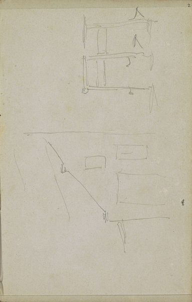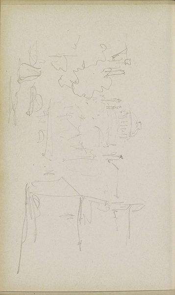 Adrianus Eversen made this drawing, "Gezicht op een straat," with pencil on paper. The composition is a delicate network of lines, a skeletal rendering of a street scene. The pale graphite evokes a sense of lightness, almost as if the buildings are mirages fading into the paper's surface. Eversen's approach here reflects a fascination with structure. Each line carefully delineates form, focusing on the geometric shapes of the buildings, windows, and roofs. There's an engagement with how these elements fit together to define urban space, creating a semiotic system of signs. It is a challenge to traditional landscape art, focusing on architectural components rather than nature. The drawing is a study in pure form. It is a representation of how we perceive and construct our environment through basic visual elements. This piece invites us to consider the act of seeing and the mental frameworks we use to interpret the world around us.