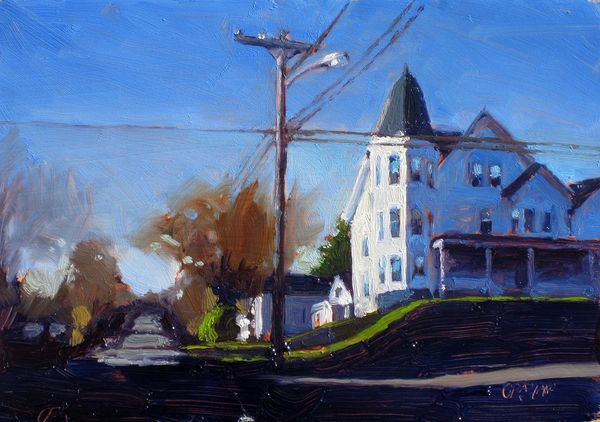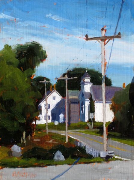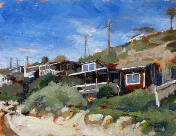 Dan Graziano painted "Morning At The Cove" using oil on, it seems, prepared board. At first glance, we’re drawn into a vibrant scene where structures, both natural and built, intertwine. Houses perch amidst lush greenery beneath a vast sky. Graziano uses visible brushstrokes and a layered approach to build up the scene. The impasto creates texture, giving a tactile quality to the foliage and architectural details. Notice the use of color: cool blues and greens contrasted with warmer tones, creating depth and visual interest. The composition emphasizes the interplay between organic forms and geometric shapes of the buildings, highlighting a tension between nature and human intervention. "Morning At The Cove" captures a moment of serenity, yet the visible brushwork reminds us of the artist's process and the constructed nature of the image. Through these visual elements, the painting offers a meditation on space, form, and the act of seeing itself.
