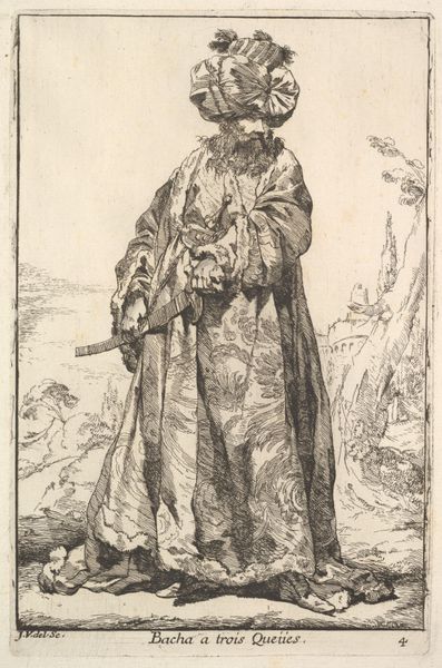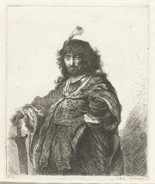 Editor: Here we have "The Persian," an etching from after 1632, housed at the Rijksmuseum, and it’s currently attributed to Anonymous. The subject seems rather self-assured, perhaps a little haughty even, standing there in his extravagant furs. I’m curious to know how someone from that period might have interpreted this depiction. What do you make of him? Curator: Indeed. The visual vocabulary deployed here evokes power and perhaps also, a certain theatricality. The oversized fur mantle, the elaborate hat with its plume, even the walking stick… these aren't simply practical items of clothing and support. They resonate with established symbolic language. Editor: How so? Curator: Think about fur. Historically, it signifies status, wealth, access to rare materials. But it's also deeply intertwined with ideas of "the exotic," the "untamed." The hat with the plume adds another layer, perhaps of military prowess or noble standing, calling forth associations of power consolidated through family ties. These aren't new associations; how do they resonate in a work of this time? Editor: That's interesting! So, is this “Persian” simply a figure, or could he represent a broader cultural idea? Curator: The title itself is revealing. The image may participate in a cultural fantasy around Persia— a land both alluring and somewhat fearsome. Note also the subtle rendering of his facial features; consider if these are meant to portray something other than ideal Western characteristics. Are they participating in an established visual rhetoric of the “other”? This visual rhetoric plays upon long standing cultural attitudes. Editor: This gives me a completely different perspective. Initially, I only considered the immediate visual elements; however, seeing them as symbols which evoke collective cultural memory is illuminating. Thank you! Curator: It’s in this tension, between the immediate image and the deep well of cultural meaning that such works truly resonate.
