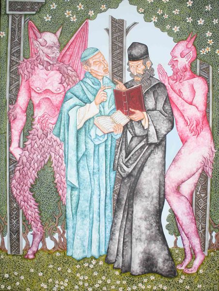 Joe Machine painted Genesis The Clothing of Adam and Eve with some kind of paint on canvas, and what strikes me first is this really interesting tension between flatness and depth. Look at how the figures seem to emerge from the background, their bodies modeled with subtle shading, yet they remain somewhat stylized and strangely two-dimensional. It's like Machine is playing with different ways of seeing, of layering space and form. I love how the blue of the cleric’s gown is rendered in these flat, vertical stripes, which somehow make him more solid, more grounded in the space, while also emphasizing the picture plane. And the way he's used these tiny dots and dashes to create texture – in the grass, the trees, the beards – it's like he's building up the image from the smallest particles, giving it this palpable, almost tactile quality. It makes me think of work by other artists who explore outsider narratives, like Forrest Bess. Ultimately, the painting remains wonderfully ambiguous, inviting us to consider the complexities of faith, knowledge, and the human condition.