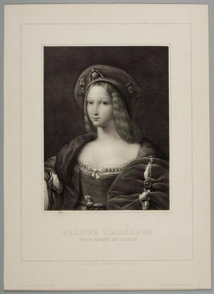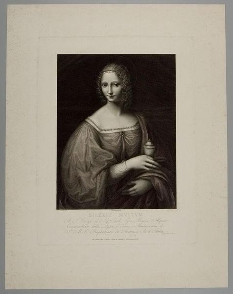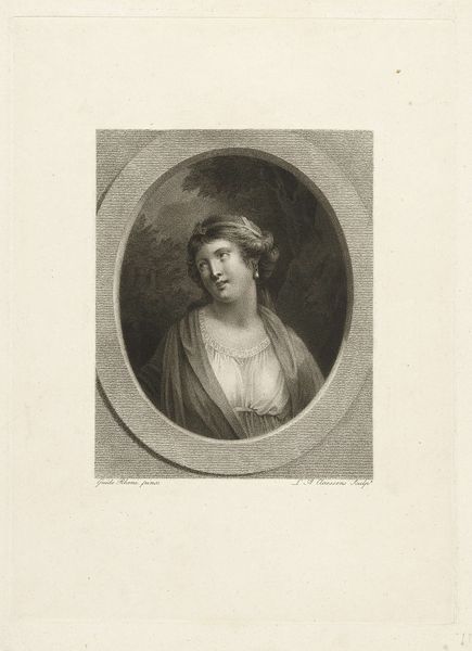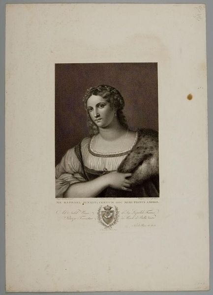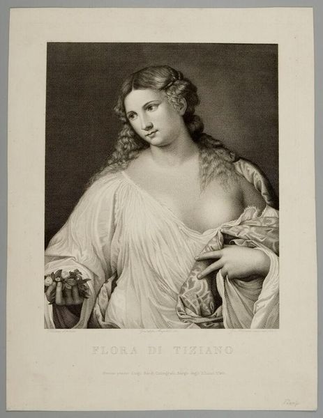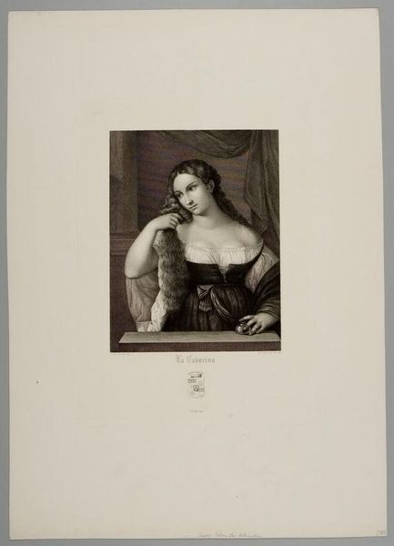 Curator: This is Luigi Boscolo's "La Fornarina," and it immediately strikes me as an intimate portrait, even though I know it's based on a Renaissance artwork. Editor: I feel the same. The original Renaissance painting is of course iconic, but this black and white recreation gives it such a different mood. Curator: It's fascinating how Boscolo uses this engraving to reframe ideas around beauty and classicism for a new audience. The title, "La Fornarina," refers to the subject's occupation. She was a baker! Editor: Yes, and it is thought she was Raphael's Roman lover. Curator: Right! So Boscolo gives a nod to this history but also presents a fresh lens through technique. It invites us to reflect on the role of women, artists, and the political power of imagery in art. Editor: Exactly. And ultimately, it reminds us how art can make us question assumptions and see with new eyes. Curator: Beautifully put.