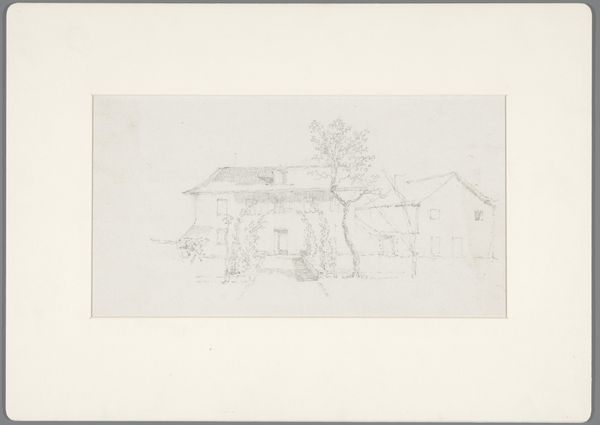 Editor: Here we have Nikolaus Hoff's "Ein Haus bei Florenz auf dem Weg nach Fiesole," a pencil drawing from 1825, rendered on paper. There's a beautiful stillness to it, a real sense of observation. How do you read the composition? Curator: Precisely. The charm lies in its unassuming structure and meticulous draftsmanship. Note the geometrical facets created with the lines defining architectural features like the staircase and walls. These shapes contribute to the overall rhythm of the design, offering a robust, functional appeal that is independent of any romanticized setting. The paper's raw state, visible within the pencil marks, acts as another dimension of surface. Editor: That's interesting. It's like the imperfections become part of the picture's formal language. The roughness of the pencil work contributes to its character. It keeps things engaging even in its austerity. Curator: Precisely, how do these lines coalesce and converse in order? The linear technique defines every texture, including those representing stonework or a distant tree. Without color, form attains paramount expressive impact, making a direct dialogue between what we perceive of and what we conceptualize as form and volume. Editor: I suppose focusing on line and form makes you strip away other potentially distracting features, focusing our attention solely on the structure before us? What about Hoff's signature? Where does that fit? Curator: An astute query! The signature itself may disrupt visual coherence if perceived outside its semiotic capacity within our reading – rather, observe its alignment alongside other angles from foundational objects presented; the house sits naturally given such spatial arrangements of planar organization in a world both rational as much beautiful here then! Editor: Thank you; viewing this within the scope you outlined really heightened how effectively simple lines can construct meaningful visual stories about places. Curator: Indeed, seeing art this way allows for timeless appreciations that survive beyond fashionable trends that alter over successive times – it lives throughout its forms forever then practically ever.