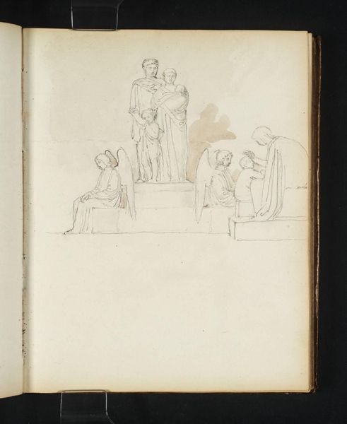 Editor: Here we have an untitled drawing by John Flaxman, housed at the Tate. It's a simple sketch of classical figures, very linear, but the book format makes me curious about its purpose. What's your take on it? Curator: Well, focusing on the material production, this likely wasn't intended as a finished art object. It's a sketch from a notebook, a record of Flaxman's thinking. The quick, unrefined lines speak to a process of exploration rather than a finalized composition. Editor: So, more about the act of creating than the creation itself? Curator: Precisely. It challenges the traditional notion of art as a polished commodity. We see the labor, the raw material of thought, before it's refined for consumption. Perhaps it’s a reflection of the artist's social context? Editor: I never considered the labor involved in a "simple" sketch. Thanks for the insight! Curator: And I appreciate your questioning of its context. It's all about layers of meaning and process.