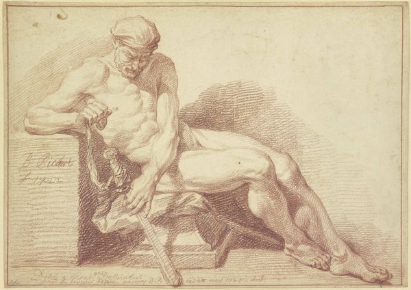 Editor: This ink drawing on paper, "Dode Christus" by Giovanni di Benedetto Bandini, dates from the late 16th century. The figure is strikingly muscular and nude, reclining in what seems like sorrowful repose. What do you see in this piece? Curator: I see a figure burdened by the weight of prophecy and the drama of salvation. Consider the pose: it isn't just rest, it’s the collapse after immense suffering. The nudity emphasizes vulnerability but, within the Mannerist style, also alludes to a classical ideal, almost a godlike perfection of form. But consider the specific details, almost anatomically correct in a way reminiscent of Michelangelo. Why use that kind of knowledge and detail to portray Christ? Editor: Perhaps it’s humanizing him, grounding the divine in a relatable physical form? Curator: Precisely! Renaissance art sought to reconcile faith with reason, merging the earthly and spiritual. Think of the cross-hatching—see how Bandini uses it to create shadows, emphasizing both the figure's musculature and the feeling of weight and despair. This technique almost literally carves out an image of deep introspection. What emotional effect does the medium create? Editor: The ink drawing's rawness amplifies the grief and starkness, lending an intimate quality, unlike grander, more polished depictions. Curator: Absolutely. And that intimacy invites us into the personal torment. By stripping away the pageantry often associated with religious scenes, Bandini delivers a visceral punch – he demands that we, too, share the weight of this moment. Editor: It’s interesting to realize how even the style, in this case Mannerism, reinforces the emotion through exaggerated form and detail. Thanks for pointing that out! Curator: My pleasure. Understanding how an artist uses symbols helps unlock the powerful, enduring emotions they evoke.