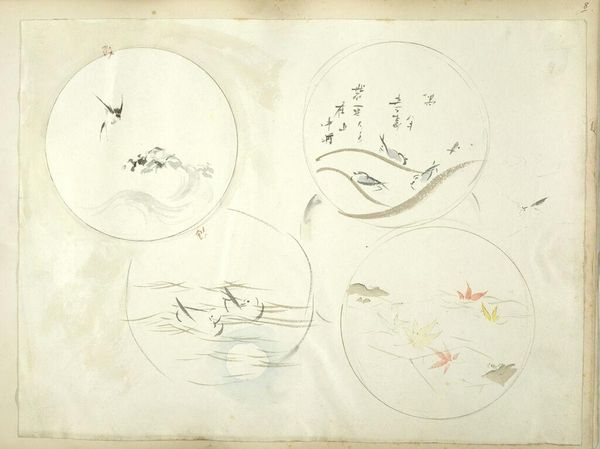 This round medallion with a double border, depicting two flying cranes above clouds, was created by Henri Cameré, using watercolor and graphite on paper. Looking closely, you'll see that the artist laid down a preliminary sketch in graphite, before applying delicate washes of watercolor to bring the scene to life. The thinness of the paper support allows the light to interact with the pigments in a subtle way. This technique suggests a connection to traditions of East Asian painting, where the qualities of ink, paper, and brushwork are essential to the overall aesthetic. The soft, muted tones and flowing lines also evoke a sense of tranquility and harmony. The cranes themselves are symbols of longevity and good fortune, adding another layer of meaning to the artwork. Cameré's choice of materials, combined with his mastery of technique, results in a work that invites contemplation and reflection. It challenges us to look beyond the image itself, and consider the cultural traditions that have shaped its creation.