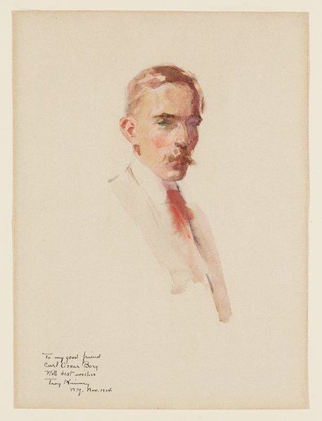 Curator: What an interesting face! He looks confident, maybe even a little confrontational. Editor: Indeed. What we have here is "Portrait of the Painter Jakob Nussbaum," an oil on canvas work by Ottilie W. Roederstein, created around 1909, and it's now held at the Städel Museum. There's a subtle dynamism that might stem from the painting being done en plein air. Curator: That makes sense. It feels very immediate, even spontaneous, in its impressionistic brushstrokes. The dominance of white clothing is very striking too – pure and almost theatrical against that muted background. He wields those brushes almost like weapons! Editor: White would definitely signal the supposed 'purity' of artistic creation but it also served practical functions, reflecting the artist’s working class. There's an inherent paradox in this image – Nussbaum, in his bright attire, presents himself in the tradition of the self-assured master painter. Curator: It almost has an otherworldly quality! Look at the brushwork in the face—Roederstein isn't simply depicting a likeness; she's hinting at something deeper. Maybe it's how he saw himself? Artists have always used portraits to mythologize themselves, after all. The palette too--held firmly with green swatches...suggestive of promise, newness. Editor: Precisely. The palette acts almost like an extension of himself and suggests the artistic class Nussbaum wanted to belong to at the time, at the turn of the century, and as for the gaze, it challenges us as viewers. Who were his influences, one wonders, to so project an artist persona? This question perhaps contextualizes our response. Curator: So, we are both caught in this gaze? Entranced in our own way by how Nussbaum sought to be perceived? Editor: That is so. It is difficult, ultimately, not to contemplate what 'the artist' looked and stood for in Roederstein's time. Curator: It leaves one reflecting not only on a man and his artistic expression but on the perpetual dance between identity, representation, and legacy. Thank you for this deeper reading!