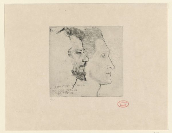 Auguste Rodin created this print of Henri Becque, the French playwright known for his naturalist dramas, using drypoint on laid paper. Rodin, living in a time of significant social change in France, captured the complexities of identity and representation through his art. Here, Becque is depicted in triplicate, each view offering a different perspective, yet together suggesting a multifaceted personality. This approach moves beyond traditional portraiture, hinting at the inner turmoil and contradictions within Becque, whose plays often challenged the norms of bourgeois society. As Rodin once said, "The artist is the confidant of nature." It is as if he sought to reveal the true nature of his subject, unfiltered and raw. The use of drypoint, with its characteristic burr, gives the image a sense of immediacy and intimacy, drawing us closer to Becque's likeness. This piece reflects how artists navigated representing individuals within the changing cultural landscape of late 19th-century France. It reminds us of the power of art to explore the depths of human character.