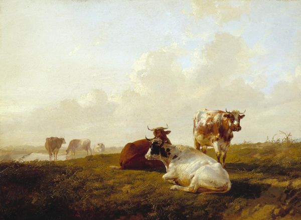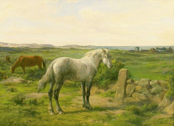 Rosa Bonheur painted this pastoral scene, "In the Meadow", with oil on canvas, capturing a peaceful moment of rural life. The horse, centrally placed, carries a shepherd boy, while sheep and cattle rest in the field, guarded by a dog. The motif of animals at rest echoes back to classical bucolic scenes. Take the image of the Golden Calf from the Old Testament, a symbol of idolatry and false worship. Here, though, the animals signify something far gentler: a harmonious relationship between humans and nature. We see an Arcadian vision of simplicity and peace. Consider the ever-changing role of the shepherd, from ancient religious symbol, as in David tending his flock, to secularized figure in pastoral paintings. This shepherd boy, with the animals, evokes a sense of calm and order. Bonheur subtly reminds us of the enduring connection between humanity and the natural world, recurring through centuries of artistic expression.