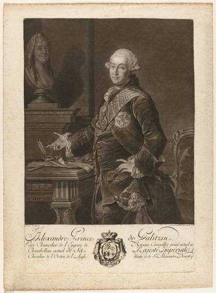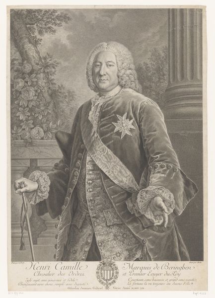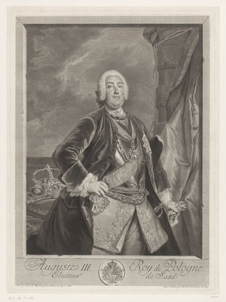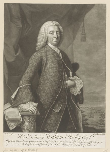 Curator: We're now looking at a print from 1747 depicting William Shirley, Governor of Massachusetts. It's a work by Peter Pelham, showcasing Shirley in a formal, Baroque style. What are your initial impressions? Editor: Stately! My first thought goes to powdered wigs and power. It's formal, yeah, but I immediately zoom in on that pointing finger. What's he pointing at? A fleet of ships, right? Suddenly it feels less about lace cuffs and more about strategy, and…possibilities. Curator: Absolutely. The fleet likely represents his involvement in military campaigns, particularly in Nova Scotia and Cape Breton, as the inscription details his role in preserving Nova Scotia and reducing the Island of Breton back to British rule. The gesture, the fleet – potent symbols. Editor: See, I find the staging fascinating. There’s almost a theatrical quality to the backdrop with that curtain, combined with his decisive gesture towards what looks like some seriously choppy water filled with boats…it suggests a narrative is playing out. One he's directing, naturally. Curator: That theatricality underscores his authority, but it also speaks to the Baroque love of drama and grand presentation. William Shirley, the man, wanted to craft a certain image of strength, control, and destiny. Editor: So, it's propaganda, almost? Elegant, sure, but with a purpose? And I notice all that script at the bottom – are those his own words? Curator: To a degree, all portraits of figures of power are propaganda. It highlights their virtues and downplays anything that would diminish their authority. The script contains text offering grateful acknowledgements to merchants and gentlemen in Boston for their roles in this… preservation and reduction. So a carefully constructed political message then. Editor: Hmm, very curated gratitude. All those ships and bluster in contrast to this rather contained little drawing… I like the subtle contradiction. He’s on display, almost pinned. It highlights this curious interplay between outward authority and maybe some inward…restraint? I suppose history does restrain us all. Curator: Well said. It’s a multi-layered artifact, offering insight into individual ambition, political strategy, and artistic trends of the time. The ships on the horizon promise journeys and conquests, all held together on one piece of paper. Editor: Exactly! Thank you for pointing out so many undercurrents to read into that bold pose and imperious gesture!