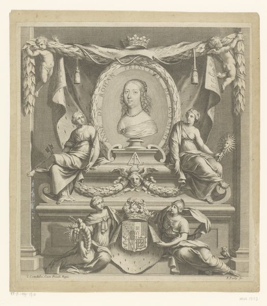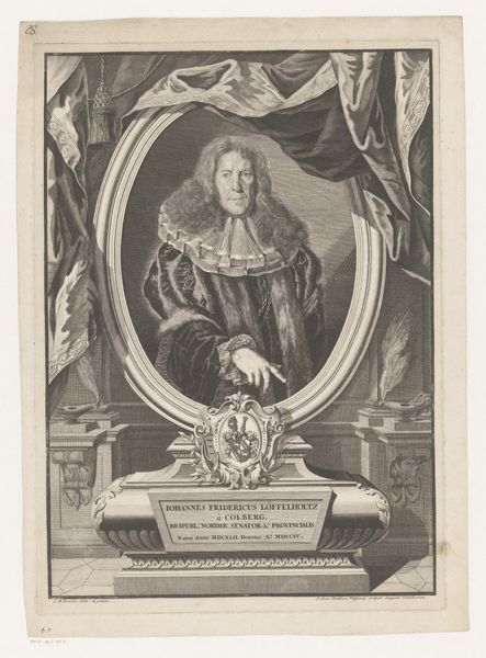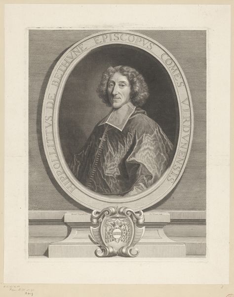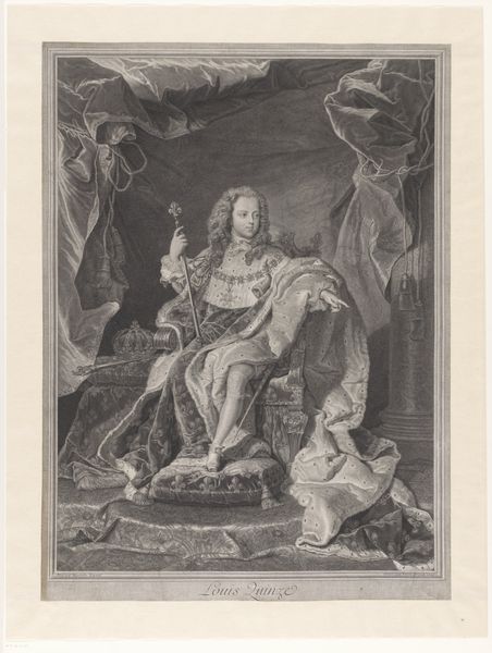 Curator: This is Pierre Drevet's engraving, "Portret van Lodewijk XV," created sometime between 1720 and 1738. It offers a fascinating depiction of the French monarch as a young man. Editor: It has a decidedly somber air about it, wouldn't you agree? Despite the finery, the lace, the symbols of power... there’s a palpable lack of joy, a weight of expectation hanging heavy. Curator: Exactly. The oval frame itself is interesting—portraits enclosed in ovals date back centuries, connecting to ancient symbols of cycles, beginnings, and endings. Framing Louis XV this way gives the image an immediate historic and symbolic depth. It pulls him into an established iconography of leadership. Editor: And below the portrait, we see the prominent display of heraldry, complete with the fleur-de-lis. A deliberate emphasis on lineage and divine right. It's worth considering what this imagery was trying to communicate, especially considering the social inequalities of the time. A clear visual reinforcement of hierarchy. Curator: Absolutely. Symbols become even more important when a ruler is young. Notice also how his garments aren’t just ornamental; they represent tangible power, an attempt to cement legitimacy in the visual landscape. What better medium to amplify the image than an engraving? It would make for easy mass reproduction and broad dissemination of royal power. Editor: A controlled image released at a critical time, a perfect example of image as propaganda. Even in a portrait—or perhaps especially in a portrait—rulers constructed very specific narratives about their reign. In this engraving, there's an active creation of royal image through fashion, heraldry and skillful staging, which raises compelling questions about what it was that the artist wanted to say about the nature of royal authority and tradition. Curator: By observing these established symbols and how they've been preserved over centuries, one might comprehend how visual communication becomes ingrained into cultural memory. Drevet’s strategic deployment of established imagery, carefully constructing Louis' regal presence within the grand baroque aesthetic, showcases continuity, memory and power. Editor: An enduring illustration that images aren't passive reflections of reality, but are active participants in the construction and reinforcement of social orders. In a few details and deliberate symbols, the image works hard to maintain systems of inequality, class and authority.