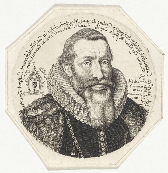 This is a portrait of Abraham Ortelius, created by an anonymous artist using engraving. The meticulous lines define the subject within a round frame, immediately drawing your eye to Ortelius's composed expression. The use of monochrome, limited to shades of black and white, focuses attention on the detailed textures and patterns. The circular frame, inscribed with Latin text, creates a visual boundary that contains and emphasizes the subject's presence. Lines form an elaborate ruff, adding depth and texture. The artist's calculated use of lines and the careful structuring of form convey not just a likeness, but also a sense of Ortelius's significance. This portrait becomes an emblem of intellectual pursuit, capturing the spirit of its subject. Notice how the circular composition and the meticulous detailing function together, transforming the individual into a symbol of knowledge. The act of viewing becomes an act of interpretation, one that understands not just the aesthetic qualities but also its cultural and historical context.