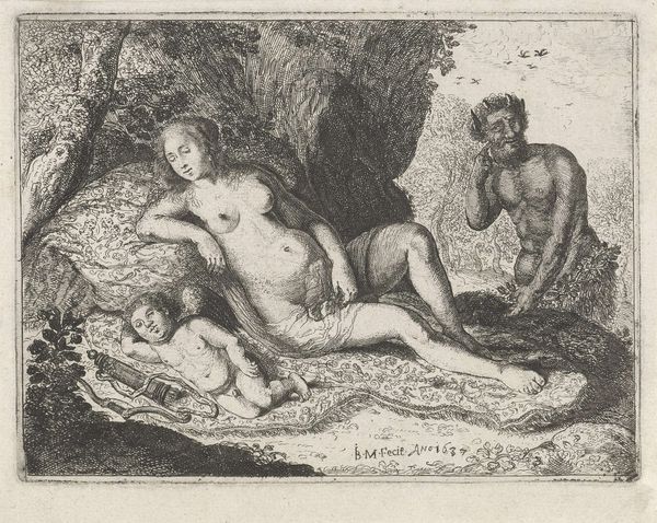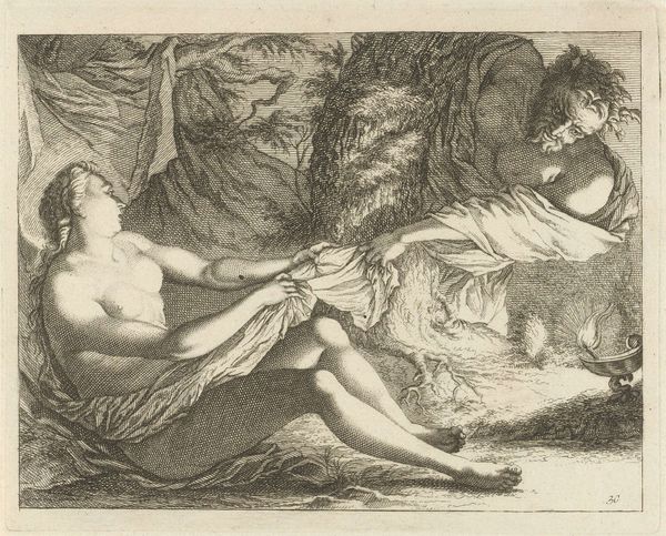 Curator: This is A. Claude Philippe de Thubières, comte de Caylus's, "Nymph Surprised by a Satyr", held here at the Harvard Art Museums. Note the dimensions: a plate measuring roughly 7 by 10 centimeters. Editor: It's small, but surprisingly dynamic. There's an unsettling tension in the composition, almost a predatory feel conveyed through the stark lines. Curator: Indeed. Caylus, a prominent figure in the 18th century, was deeply interested in artistic production. He was fascinated by the processes of printmaking and its democratization of images. Editor: So, we're not just looking at the depiction of a mythological scene, but also considering the materials and the method of its creation, the labor involved. How was this print circulated, consumed? Curator: Exactly. These images were often disseminated among collectors, serving as a form of currency within artistic circles. The very act of producing and possessing such prints held social weight. Editor: And it allowed for a wider audience to engage with classical themes, albeit through the lens of aristocratic taste and patronage. Curator: Precisely. This piece offers insight into artistic creation, social status, and the distribution of imagery in 18th century France. Editor: It makes you think about who had access to these images, and how the story of the nymph and satyr was molded by the means of its production.