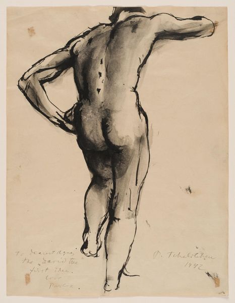 This is a pencil drawing of a Standing Male Nude, made by Camille Corot. The choice of pencil as a medium has a direct impact on the final appearance of the drawing. The artist used the pencil to create soft, delicate lines. The drawing's texture is smooth and fine, which is characteristic of the medium. The weight of the pencil strokes varies from light to heavy, adding depth and dimension to the figure. The artist captured the essence of the human form with minimal detail. The production process involved the use of a pencil, a simple tool that has been used for centuries, a craft tradition that is often overlooked in favor of more glamorous, 'high art' media like painting or sculpture. Corot elevated the status of pencil drawing through his skill and artistry. By using this accessible material to create a beautiful work of art, Corot challenges traditional distinctions between fine art and craft. Ultimately, it's through these materials, processes, and context that we truly understand an artwork's full meaning.