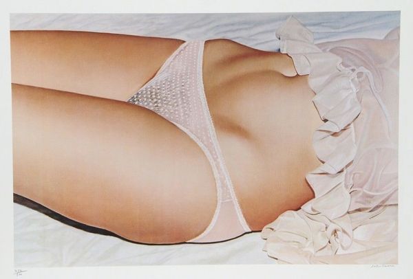 John Kacere created this painting using traditional techniques of oil on canvas. But there's nothing particularly traditional about the subject. Kacere dedicated his practice to close-up depictions of the female torso. The tight crop magnifies the intimate details of the body, lingerie, and fabric. Look closely at the rendering of the lace, garter belt, and stockings, which are all mass-produced objects of desire. The time-consuming labor of painting is in stark contrast to the ready-made materials depicted. Kacere’s meticulous realism blurs the lines between painting and photography, while challenging conventional notions of taste, beauty, and sexuality. By elevating these everyday materials to the realm of fine art, Kacere prompts us to reconsider the relationship between production, consumption, and representation.