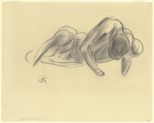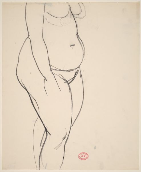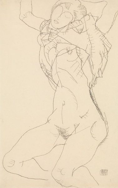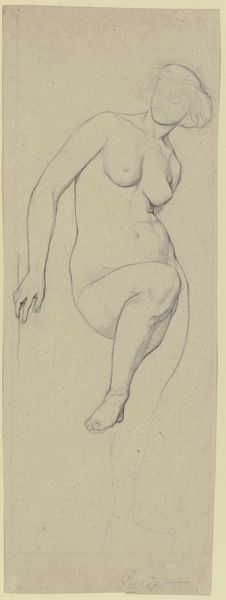 Curator: Immediately, I notice the stark simplicity and the artist’s incredible skill in conveying form with so few lines. It feels incredibly direct, a raw and immediate expression of the female figure. Editor: That's right. What we have here is a drawing by J.A. Jerichau dating from 1915, titled "Kvindelig model, liggende"—"Female model, lying down". Curator: “Lying down,” but I see her almost rising up, doesn’t she seem in motion, defiant even? I'm curious about the perspective. It disrupts the passive nature often associated with nudes in art history. What do you make of it? Editor: Yes, the composition is quite unconventional. I would read it through the symbolic legacy of the female form in art – a powerful figure but at an intimate and even vulnerable angle. Curator: Right, and I think situating this within its historical moment is vital. 1915, the throes of World War I... this image feels like a defiant affirmation of the body. This rendering resists objectification. Her agency is subtly palpable. Editor: Indeed. Also, consider the cultural context within Scandinavian art; there’s often a dialogue of symbolism between light and dark. The drawing favors raw form; the model exists starkly, simply, undeniably. Curator: What truly strikes me is how a simple pencil on paper evokes so much physicality. Each stroke holds weight, shadow, volume. How do you perceive it psychologically, seeing as our perception of the female body is often laden with imposed standards? Editor: The power of a sketch such as this is in its honesty. In art history the female form may serve as a visual representation of vulnerability. A drawing like this reveals the internal fortitude and psychological complexities the model exudes. There’s both universal recognisability, yet also particularity in her expression that adds weight. Curator: Absolutely. Ultimately, it provokes critical reflection not just about the representation of women in art, but also how women claim spaces, narratives, their very bodies, both then and now. Editor: I think so too, it asks us to think more deeply about what we consider "classic" forms. Thank you, this has made the image and our role in receiving its weight even clearer to me.