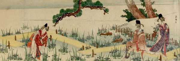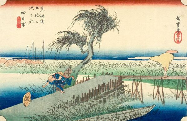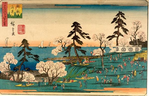 Curator: This is Utagawa Kuniyoshi's "Åmori, from the series Famous Places in the Eastern Capital." Kuniyoshi, active in the 19th century, captured everyday life in Edo—now Tokyo. Editor: It feels like a scene from a dream, doesn't it? The light is so soft, and those reeds loom like ancient guardians. Curator: Indeed. Kuniyoshi's work provides insight into the social hierarchy and cultural values of the era, even in seemingly simple landscapes. Consider the figures in the boat; their posture, clothing. Editor: They're just drifting along, part of the scenery. Makes you wonder what they're thinking, what stories they carry with them. It’s funny how a simple scene can feel so complex. Curator: Precisely. Kuniyoshi offers us a glimpse into their lived experience, hinting at the broader currents of Edo society. Editor: I like how the moon, or is it the sun?, watches over them. Like a silent witness. It really places us in that moment, in their little boat, surrounded by whispering reeds. Curator: The beauty is how Kuniyoshi makes us consider the specific within the universal. Editor: Beautiful. It's like catching a memory in a bottle.