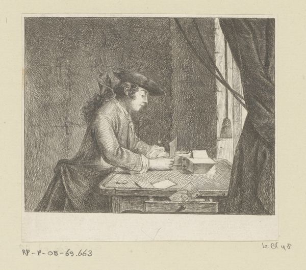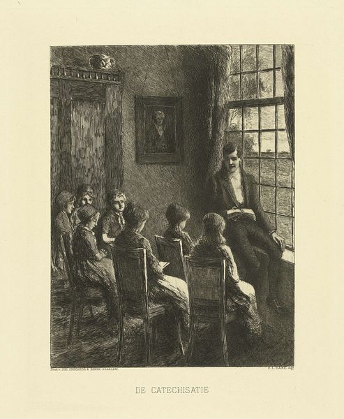 Editor: Here we have Willem Steelink’s "Moeder met twee kinderen aan tafel," or "Mother with two children at the table," created sometime between 1866 and 1886. It’s a rather somber scene depicted through etching, ink, and pencil on paper. There's an enclosed, almost claustrophobic feeling about it. What historical insights can you offer? Curator: The image certainly resonates with a sense of domesticity and perhaps a certain quiet resignation, common themes within 19th-century genre painting. The detailed interior, with its window, framed pictures, and shelf filled with plates, hints at the cultural value placed on the home as a private sphere, particularly for women. Do you see how the composition, with the mother centrally positioned and the children flanking her, reinforces this idea of the woman as the heart of the household? Editor: Yes, that’s very clear. But does the image challenge or reinforce existing social structures of the time? It seems a bit melancholy rather than celebratory. Curator: That’s a crucial point. Consider the burgeoning Realism movement. Artists were turning away from romanticized portrayals and instead depicting everyday life with unflinching honesty. This image, while seemingly benign, could be subtly critiquing the limitations placed upon women within the domestic sphere. The mother’s gaze seems almost weary, doesn’t it? The composition almost makes one consider the socio-economic constraints experienced by women of the period. Editor: That’s fascinating! I initially saw the scene as simply a glimpse into domestic life, but now I see how it also subtly reflects social dynamics. Curator: Exactly. And that’s the power of art. It invites us to consider not just what we see, but also the context within which it was created and received. It really shows us how powerful and influential Realism truly was in shifting society’s perspective on daily life. Editor: Thanks! It’s really opened my eyes to how even seemingly simple domestic scenes can be rich with social and political implications.