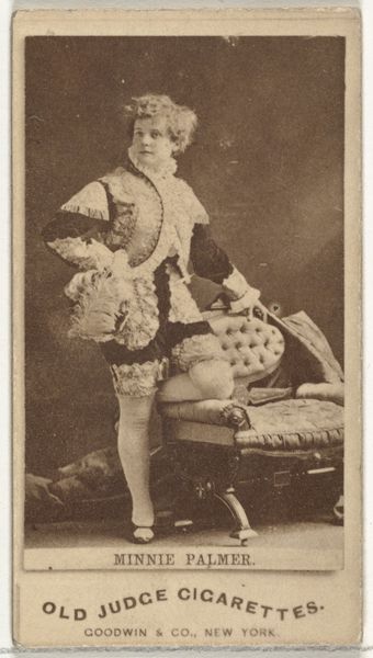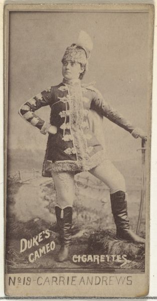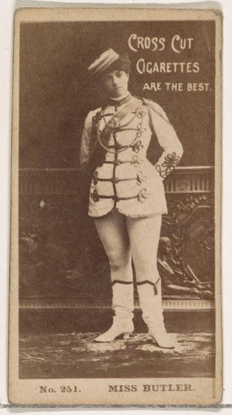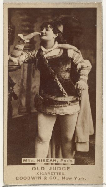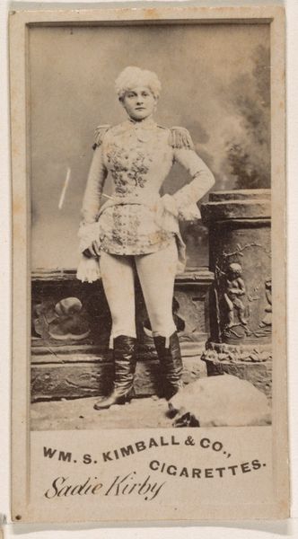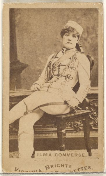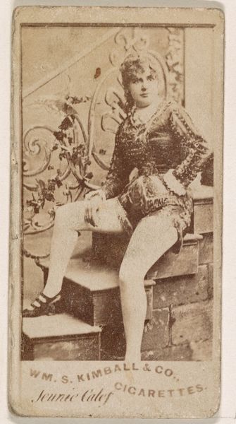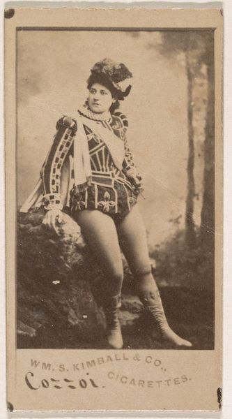 Editor: So, here we have a print from 1885-1891, "Mlle. Croizet, Paris," a portrait from the Actors and Actresses series by Allen & Ginter, originally for Virginia Brights Cigarettes. The figure is rather striking. I am intrigued by the somewhat unusual androgynous outfit of the sitter. What strikes you first about this image? Curator: Immediately, I notice the geometric interplay between the subject and the architectural backdrop. Observe how her pose – the angle of her legs, the placement of her arms – mirrors and yet disrupts the linear rigidity of the balustrade. The composition achieves a pleasing tension between organic form and constructed space. Editor: I see what you mean. The curved lines of her body against the straight lines of the balustrade creates a deliberate visual contrast. The colour palette is muted; I feel that it further accentuates these underlying geometric forms. Is there anything to read in her sartorial choices? Curator: The costume introduces a theatrical element. What semiotic reading can we gather from its ornamental details? Consider the braiding and adornments - how does it highlight her, while simultaneously placing her into a staged setting? Are we looking at an actor out of costume, or rather an invitation into her art? Editor: That's fascinating. I hadn't thought of it that way. Maybe she’s not simply "a woman in fancy dress," but this image is an intriguing layering of identity, representation and artifice. Curator: Precisely! Her knowing gaze, coupled with her ambiguous attire, further problematises a straightforward interpretation of the portrait. What narrative is evoked through the work’s various representational elements? Editor: This exercise really helped me to see much more in this photo. Thank you. Curator: And I, for one, greatly enjoyed our analytical discussion of the interplay between form and representation in this particular piece.
