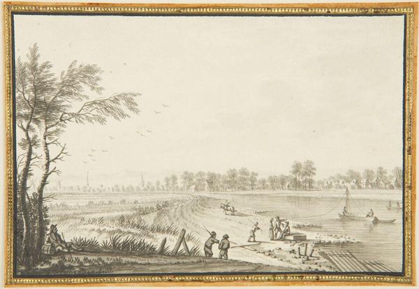 Editor: Here we have Karl Ludwig Zehender's "Rhine View," a delicate drawing held at the Harvard Art Museums. It evokes a sense of pastoral tranquility. What do you see in this piece that speaks to its historical context? Curator: Well, consider the Rhine itself. Throughout history, it's been a crucial trade route, border, and source of cultural identity. Zehender's focus on everyday life along the river, rather than grand historical events, reflects a shift in artistic and social values. How might this depiction of ordinary people interacting with the landscape influence viewers? Editor: It makes the scene feel more relatable, less about power and more about community. I hadn't considered the Rhine's importance beyond its beauty. Curator: Exactly. The image becomes a statement about the value of the common person and their connection to the land. It's a subtle, but powerful message. Editor: This has really changed my perspective on what I initially saw as just a pretty landscape. Curator: Indeed. Art is always a dialogue with its time.