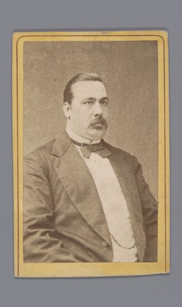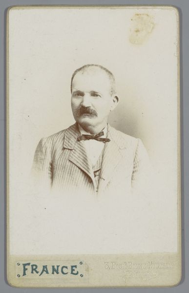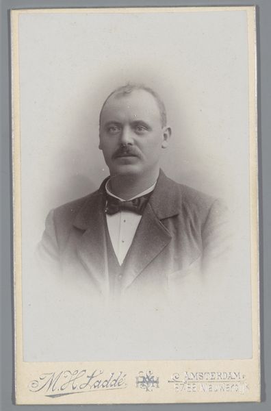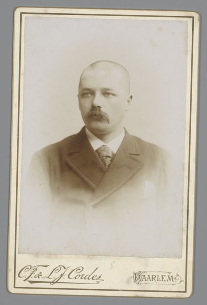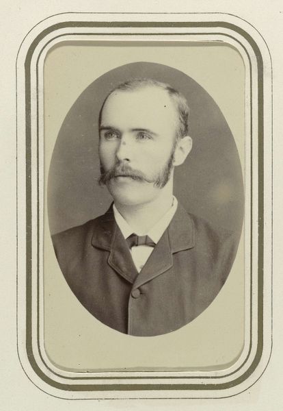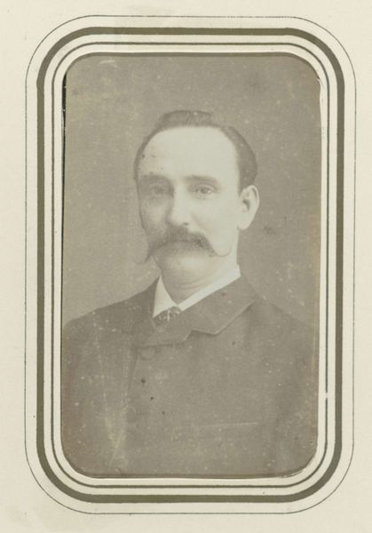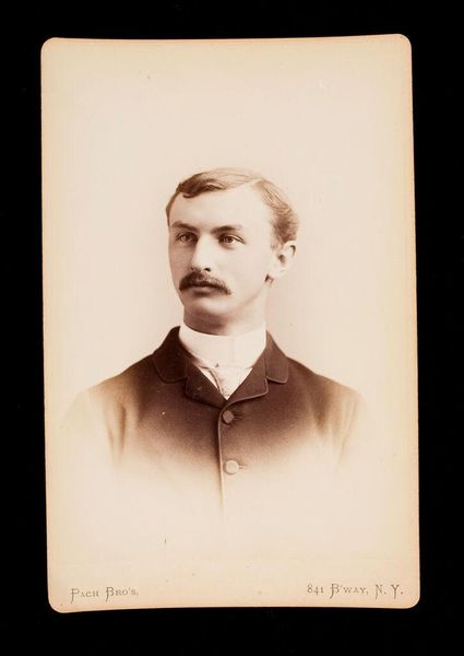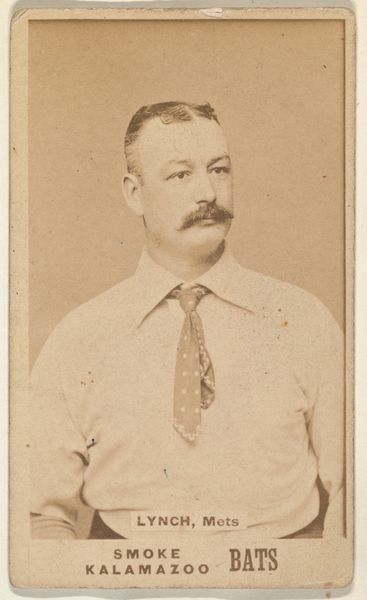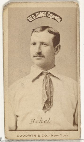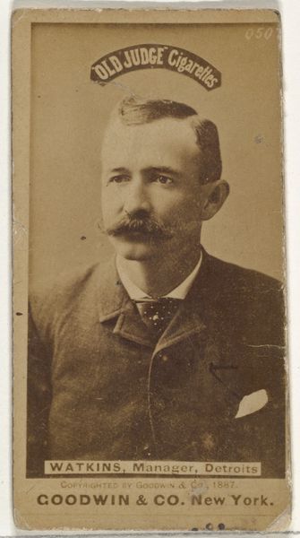 Curator: This albumen print from around 1887-1890 depicts Frank Edward Hankinson, a baseball player, as part of the "Old Judge Cigarettes" series. Editor: What immediately strikes me is the tight composition. The sepia tones lend it an antique solemnity, focusing attention intensely on Hankinson's features and neatly groomed mustache. Curator: Indeed. The composition is strategic, maximizing the limited space of the card format. Note how the name "Hankinson" is inscribed below, mirroring the placement of the "Old Judge Cigarettes" logo above. It all seems designed for ease of reading at a small scale. Editor: The albumen print medium lends the photograph a richness in tonal range, subtly articulating the planes of his face. One might consider it as more than mere photographic recording; it evokes a hand-drawn portrait, idealizing the sitter's image through light and shadow. The effect contributes to its commodification, inviting consumption on multiple levels. Curator: Precisely. Produced by Goodwin & Company, the card's intention becomes apparent; it served not only as an advertisement but also as a collectible. These cards fostered an intimate relationship between consumers and public figures like baseball players. In a way, mass-produced and accessible imagery transformed Hankinson into a brand, furthering celebrity culture through a novel form of circulation. Editor: It's intriguing how the rigid collar almost frames his face, adding to this formal, stoic demeanor. He looks directly at the viewer, establishing a visual connection. He appears robust. Perhaps such associations—of athletic strength, forthrightness, all wrapped in a carefully produced print—are exactly what the advertisers wanted you to associate with their cigarettes. Curator: Absolutely. Advertising like this constructed the narrative that smoking Old Judge Cigarettes was somehow connected to the virility and respectability exemplified by these athletes. What might appear as simple memorabilia is embedded in social and marketing strategies. Editor: The power of observation lies in unlocking such subtleties. A small print can reveal expansive socio-cultural readings when given due attention. Curator: It enriches our understanding of the artwork, reminding us to look beyond face value and contextualize.