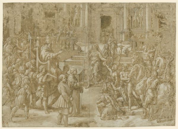 Pietro Testa created this print, "Sinorix carried from the temple of Artemis trying to escape the effects of the poisoning," in the 17th century. Observe how the composition, structured by the receding lines of architecture, guides our eye from the temple on the left to the frenzied escape on the right. The artist employs a dense network of fine lines to build form and texture, creating a dramatic scene filled with emotional intensity. Testa, influenced by both classical and baroque styles, shows how established meanings can be destabilized by the raw, chaotic energy of human drama. The temple, a symbol of order, is juxtaposed with the disorder of the figures, highlighting a tension between reason and passion. Notice how the use of hatching and cross-hatching not only models the figures but also contributes to the overall sense of urgency and movement. This dynamic use of line and form invites us to consider how art can engage with new ways of thinking about perception and representation.